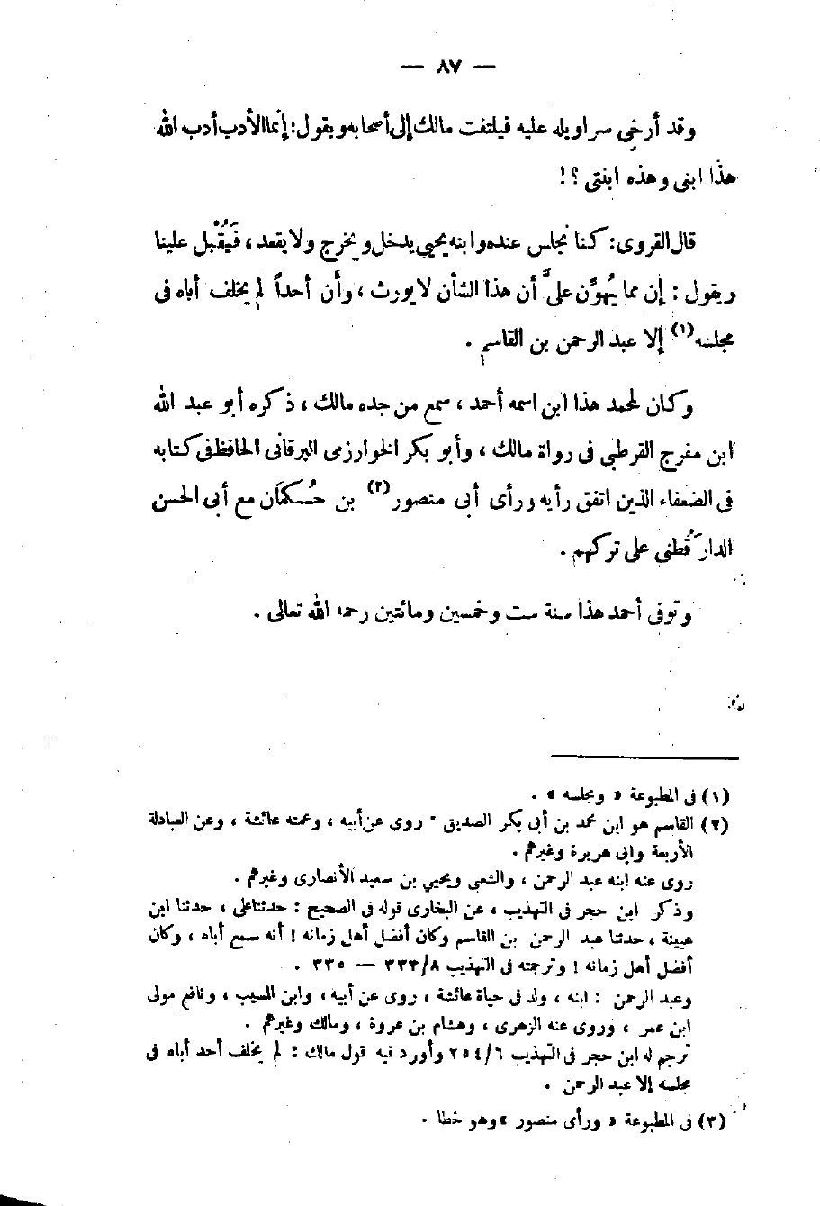 قال القروي: كنا نجلس عنده وابنه يحيى يدخل ويخرج ولا يقعد فيقبل علينا ويقول: إن ما يهون علي أن هذا الشأن لا يورث وأن أحداً لم يخلف أباه ومجلسه إلا عبد الرحمن بن القاسم. وكان لمحمد هذا ابن اسمه أحمد سمع من جده مالك ذكره أبو عبد الله بن مفرج القرطبي في رواة مالك وأبو بكر الخوارزمي البرقاني الحافظ في كتابه في الضعفاء الذي اتفق رأيه ورأي أبي منصور بن حكمان مع أبي الحسن الدارقطني على تركهم. وتوفي أحمد هذا سنة ست وخمسين ومائتين رحمه الله تعالى.
