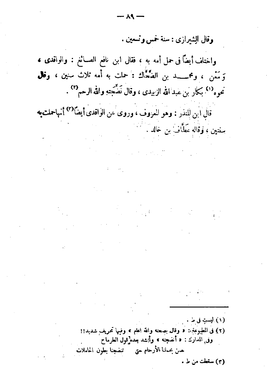 واختلف أيضاً في حمل أمه به فقال بن نافع الصائغ: والواقدي ومعن ومحمد بن الضحاك: حملت به أمه ثلاث سنين وقال نحوه بكار بن عبد الله الزبيدي وقال نضجته والله الرحم. قال بن المنذر: وهو المعروف وروى عن الواقدي أيضاً أنها حملت به سنتين وقاله عطاف بن خالد.
