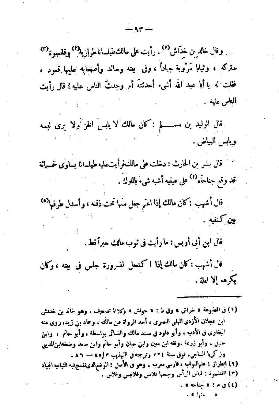 وقال خالد بن خداش: رأيت على مالك طيلساناً طرازياً وقلنسوة متركه وثياباً مروية جياداً وفي بيته وسائد وأصحابه عليها قعود فقلت له يا أبا عبد الله أشيء أحدثته أم وجدت الناس عليه: قال رأيت الناس عليه.