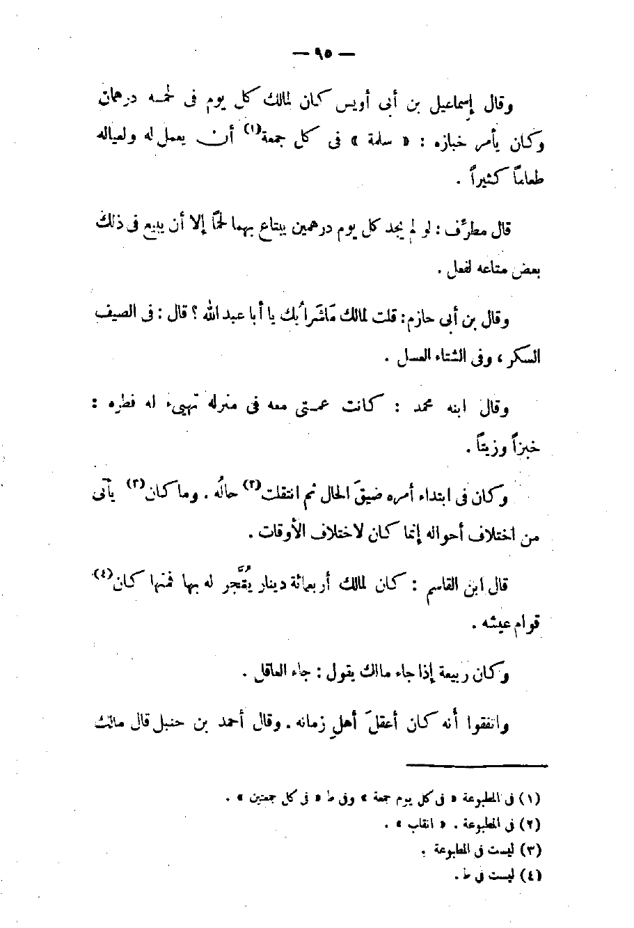 وقال إسماعيل بن أبي أويس كان لمالك كل يوم في لحمه درهمان وكان يأمر خبازه: سلمة في كل يوم جمعة أن يعمل له ولعياله طعاماً كثيراً. قال مطرف: لو لم يجد كل يوم درهمين يبتاع بهما لحماً إلا أن يبيع في ذلك بعض متاعه لفعل.