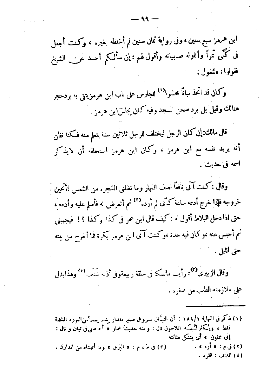 وقال: كنت آتى نافعاً نصف النهار وما تظلني الشجرة من الشمس: أتحين خروجه فإذا خرج أدعه ساعة كأني لم أرده ثم أتعرض له فأسلم عليه وأدعه حتى إذا دخل البلاط أقول له: كيف قال بن عمر في كذا وكذا؟ فيجيبني ثم أحبس عنه وكان فيه حدة وكنت آتي بن هرمز من بكرة فما أخرج من بيته حتى الليل.