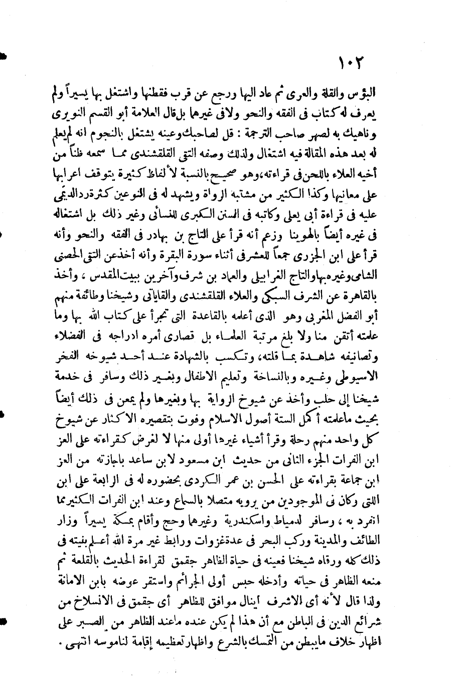 الْبُؤْس والقلة والعرى ثمَّ عَاد إِلَيْهَا وَرجع عَن قرب فقطنها واشتغل بهَا يَسِيرا وَلم يعرف لَهُ كتاب فِي الْفِقْه والنحو وَلَا فِي غَيرهمَا بل قَالَ الْعَلامَة أَبُو الْقسم النويري وناهيك بِهِ لصهر صَاحب التَّرْجَمَة: قل لصاحبك وعينه يشْتَغل بالنجوم أَنه لم يعلم لَهُ بعد هَذِه الْمقَالة فِيهِ اشْتِغَال وَلذَلِك وَصفه التقي القلقشندي مِمَّا سَمعه ظنا من أَخِيه الْعَلَاء باللحن فِي قِرَاءَته وَهُوَ صَحِيح بِالنِّسْبَةِ لألفاظ كَثِيرَة يتَوَقَّف أعرابها على مَعَانِيهَا وَكَذَا الْكثير من مشتبه الروَاة وَيشْهد لَهُ فِي النَّوْعَيْنِ كَثْرَة رد الديمي عَلَيْهِ فِي قِرَاءَة أبي يعلى وكاتبه فِي السّنَن الْكُبْرَى للنسائي وَغير ذَلِك بل اشْتِغَاله فِي غَيره أَيْضا بالهوينا وَزعم أَنه قَرَأَ على التَّاج بن بهادر فِي الْفِقْه والنحو وَأَنه قَرَأَ على ابْن الْجَزرِي جمعا للعشر فِي أثْنَاء سُورَة الْبَقَرَة وَأَنه أَخذ عَن التقي الحصني الشَّامي وَغَيره بهَا والتاج الغرابيلي والعماد بن شرف وَآخَرين بِبَيْت الْمُقَدّس وَأخذ بِالْقَاهِرَةِ عَن الشّرف السُّبْكِيّ والْعَلَاء القلقشندي والقاياتي وَشَيخنَا وَطَائِفَة مِنْهُم أَبُو الْفضل المغربي وَهُوَ الَّذِي أعلمهُ بالقاعدة الَّتِي تجرأ على كتاب الله بهَا وَمَا عَلمته أتقن منا وَلَا بلغ مرتبَة الْعلمَاء بل قصارى أمره إدراجه فِي الْفُضَلَاء وتصانيفه شاهدة بِمَا قلته وتكسب بِالشَّهَادَةِ عِنْد أحد شُيُوخه الْفَخر الأسيوطي وَغَيره وبالنساخة وَتَعْلِيم الْأَطْفَال وَبِغير ذَلِك وسافر فِي خدمَة شَيخنَا إِلَى حلب وَأخذ عَن شُيُوخ الرِّوَايَة بهَا وبغيرها وَلم يمعن فِي ذَلِك أَيْضا بِحَيْثُ مَا عَلمته أكمل السِّتَّة أصُول الْإِسْلَام وفوت بتقصيره الْإِكْثَار عَن شُيُوخ كل وَاحِد مِنْهُم رحْلَة وَقَرَأَ أَشْيَاء غَيرهَا أولى مِنْهَا لَا لغَرَض كقراءته على الْعِزّ بن الْفُرَات الْجُزْء الثَّانِي من حَدِيث ابْن مَسْعُود لِابْنِ ساعد بإجازته من الْعِزّ بن جمَاعَة بقرَاءَته على الْحسن بن عمر الْكرْدِي بِحُضُورِهِ لَهُ فِي الرَّابِعَة على ابْن اللتي وَكَانَ فِي الْمَوْجُودين من يرويهِ مُتَّصِلا بِالسَّمَاعِ وَعند ابْن الْفُرَات الْكثير مِمَّا انْفَرد بِهِ وسافر لدمياط واسكندرية وَغَيرهمَا وَحج وَأقَام بِمَكَّة يَسِيرا وزار الطَّائِف وَالْمَدينَة وَركب الْبَحْر فِي عدَّة غزوات ورابط غير مرّة الله أعلم بنيته فِي ذَلِك كُله ورقاه شَيخنَا فعينه فِي حَيَاة الظَّاهِر جقمق لقِرَاءَة الحَدِيث بالقلعة ثمَّ مَنعه الظَّاهِر فِي حَيَاته وَأدْخلهُ حبس أولى الجرائم وَاسْتقر عوضه بِابْن الْأَمَانَة وَلذَا قَالَ لِأَنَّهُ أَي الْأَشْرَف اينال مُوَافق للظَّاهِر أَي جقمق فِي الانسلاخ من شرائع الدّين فِي الْبَاطِن مَعَ أَن هَذَا لم يكن عِنْده مَا عِنْد الظَّاهِر من الصَّبْر على إِظْهَار خلاف مَا يبطن من التَّمَسُّك بِالشَّرْعِ وَإِظْهَار تَعْظِيمه إِقَامَة)