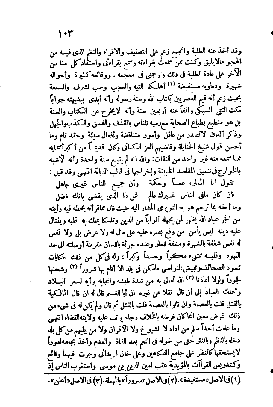 وَمَا أحقه بِمَا ترْجم هُوَ بِهِ النويري الْمشَار إِلَيْهِ حَيْثُ قَالَ مِمَّا قرأته بِخَطِّهِ فِيهِ رَأَيْته من أفجر عباد الله يظْهر لمن يجهله أثوابا من الدّين وتنسكا يملك بِهِ قلبه ويغتال عَلَيْهِ دينه لَيْسَ يَأْمَن من وَقع بَصَره عَلَيْهِ على مَال لَهُ وَلَا عرض بل وَلَا نفس لَهُ نفس شغفة بالشهرة ومشفة للعلو وَعِنْده جرْأَة بِاللِّسَانِ مفرطة أوصلته إِلَى حد التهور وَقَلبه ممتلئ مكرا وحسدا وكبرا وَله فِي كل من ذَلِك حكايات تسود الصحائف وتبيض النواصي مَا سكن فِي بلد إِلَّا أَقَامَ بهَا شرورا وشحنها فجورا وَلَوْلَا أعاذنا الله تَعَالَى بِهِ من شدَّة طيشه وإعجابه بِرَأْيهِ لسعر الْبِلَاد وَأهْلك الْعباد إِلَى أَن قَالَ نقلا عَن غَيره أَن أَبَا الْقسم قَالَ لَهُ أَن قَالَ الْمَالِكِيَّة بِالْقَتْلِ قلت بالعصمة وَإِن قَالُوا بالعصمة قلت بِالْقَتْلِ ثمَّ قَالَ وَلم يكن لَهُ فِي شَيْء من ذَلِك غَرَض معِين إِنَّمَا كَانَ غَرَضه بِالْخِلَافِ رَجَاء يرتب عَلَيْهِ ولَايَته الْقَضَاء انْتهى وَمَا علمت أحدا سلم من أَذَاهُ لَا الشُّيُوخ وَلَا الأقران وَلَا من يليهم من كل بلد دخله بالنظم وبالنثر حَتَّى من خوله فِي النعم بعد الْفَاقَة والعدم وَأخذ بجاهه أمورا لَا يَسْتَحِقهَا كالنظر على جَامع الفكاهين وعَلى خَان اويداني وَجَرت فيهمَا وقائع وكتدريس القراآت بالمؤيدية عقب أَمِين الدّين بن مُوسَى واستغرب النَّاس إِذْ