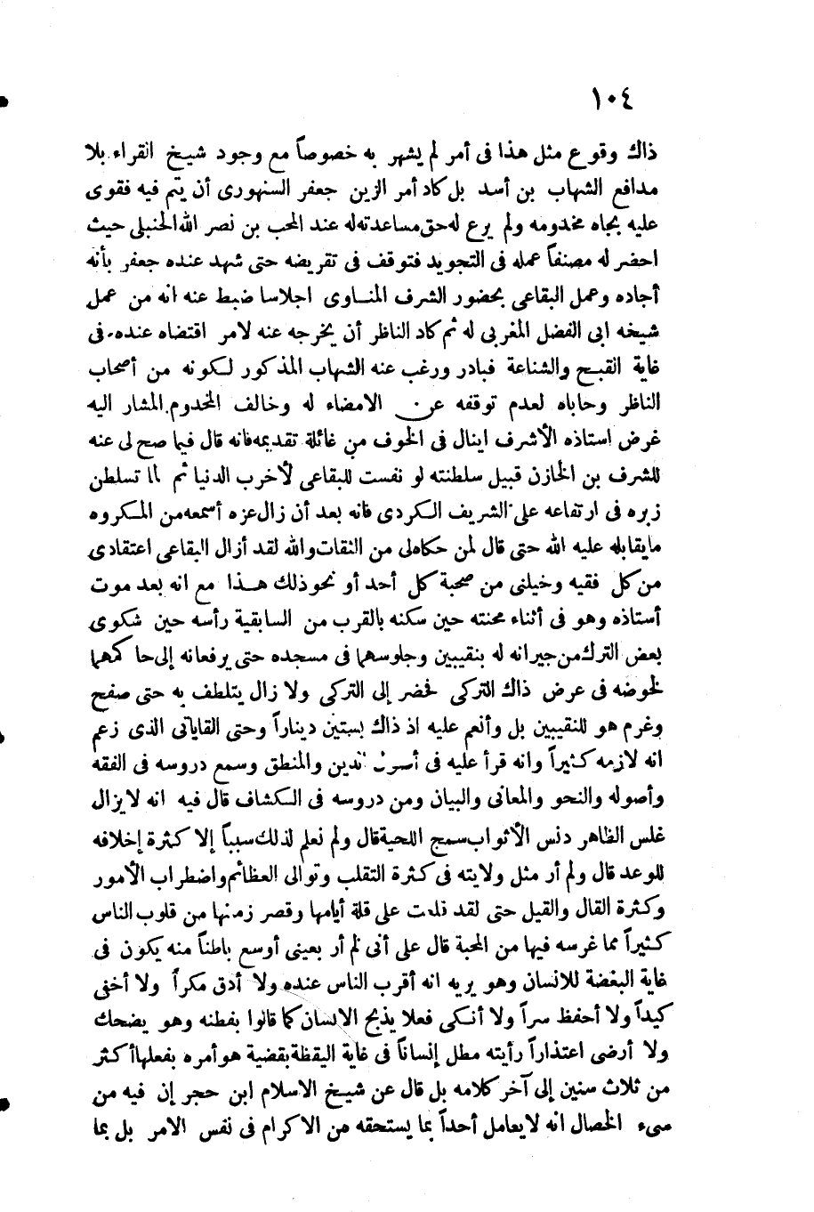 مثل هَذَا فِي أَمر لم يشهر بِهِ خُصُوصا مَعَ وجود شيخ الْقُرَّاء بِلَا مدافع الشهَاب بن أَسد بل كَاد أَمر الزين جَعْفَر السنهوري أَن يتم فِيهِ فقوى عَلَيْهِ بجاه مخدومه وَلم يرع لَهُ حق مساعدته لَهُ عِنْد الْمُحب بن نصر الله الْحَنْبَلِيّ حَيْثُ أحضر لَهُ مصنفا عمله فِي التجويد فتوقف فِي تقريضه حَتَّى شهد عِنْده جَعْفَر بِأَنَّهُ أجاده وَعمل البقاعي بِحُضُور الشّرف الْمَنَاوِيّ إجلاسا ضبط عَنهُ أَنه من عمل شَيْخه أبي الْفضل المغربي لَهُ ثمَّ كَاد النَّاظر أَن يُخرجهُ عَنهُ لأمر اقْتَضَاهُ عِنْده فِي غَايَة الْقبْح والشناعة فبادر وَرغب عَنهُ الشهَاب الْمَذْكُور لكَونه من أَصْحَاب النَّاظر وحاباه لعدم توقفه عَن الْإِمْضَاء لَهُ وَخَالف المخدوم الْمشَار إِلَيْهِ غَرَض أستاذه الْأَشْرَف اينال فِي الْخَوْف من غائلة تَقْدِيمه فَإِنَّهُ قَالَ فِيمَا صَحَّ لي عَنهُ للشرف بن الخازن قبيل سلطنته لَو نفست للبقاعي لأخرب الدُّنْيَا ثمَّ لما تسلطن زبره فِي ارتفاعه على الشريف الْكرْدِي فَإِنَّهُ بعد أَن زَالَ عزه أسمعهُ من الْمَكْرُوه مَا يُقَابله عَلَيْهِ الله حَتَّى قَالَ لمن حَكَاهُ لي من الثِّقَات وَالله لقد أَزَال البقاعي اعتقادي من كل فَقِيه وخيلني من صُحْبَة كل أحد أَو نَحْو ذَلِك هَذَا مَعَ أَنه بعد موت أستاذه وَهُوَ فِي أثْنَاء محنته حِين سكنه بِالْقربِ من السابقية رَأسه حِين شكوى بعض التّرْك من جِيرَانه لَهُ بنقيبين وجلوسهما فِي مَسْجده حَتَّى يرفعانه إِلَى حاكمهما لخوضه فِي عرض ذَاك التركي فَحَضَرَ إِلَى التركي وَلَا زَالَ يتلطف بِهِ حَتَّى صفح وَغرم هُوَ للنقيبين بل وأنعم عَلَيْهِ إِذْ ذَاك بستين دِينَارا وَحَتَّى القاياتي الَّذِي زعم أَنه لَازمه كثيرا وَأَنه قَرَأَ عَلَيْهِ فِي أصُول الدّين والمنطق وَسمع دروسه فِي الْفِقْه وأصوله والنحو والمعاني وَالْبَيَان وَمن دروسه فِي الْكَشَّاف قَالَ فِيهِ أَنه لَا يزَال غلس الظَّاهِر دنس الأثواب سمج اللِّحْيَة قَالَ وَلم نعلم لذَلِك سَببا إِلَّا كَثْرَة إخلافه للوعد قَالَ وَلم أر مثل ولَايَته فِي كَثْرَة التقلب وتوالي العظائم واضطراب الْأُمُور وَكَثْرَة القال والقيل حَتَّى لقد قلعت على قلَّة أَيَّامهَا وَقصر زَمَنهَا من قُلُوب النَّاس كثيرا مِمَّا غرسه فِيهَا من الْمحبَّة قَالَ على أَنِّي لم أر بعيني أوسع بَاطِنا مِنْهُ يكون فِي غَايَة البغضة للْإنْسَان وَهُوَ يرِيه أَنه أقرب النَّاس عِنْده وَلَا أدق مكرا وَلَا أخْفى كيدا وَلَا أحفظ سرا وَلَا أنكى فعلا يذبح الْإِنْسَان كَمَا قَالُوا بفطنه وَهُوَ يضْحك وَلَا أرْضى اعتذارا رَأَيْته مطل إنْسَانا فِي غَايَة الْيَقَظَة بقضية هُوَ أمره بِفِعْلِهَا أَكثر من ثَلَاث سِنِين إِلَى آخر كَلَامه بل قَالَ عَن شيخ الْإِسْلَام ابْن حجر إِن فِيهِ من سيء الْخِصَال أَنه لَا يُعَامل أحدا بِمَا يسْتَحقّهُ من الْإِكْرَام فِي نفس الْأَمر بل بِمَا