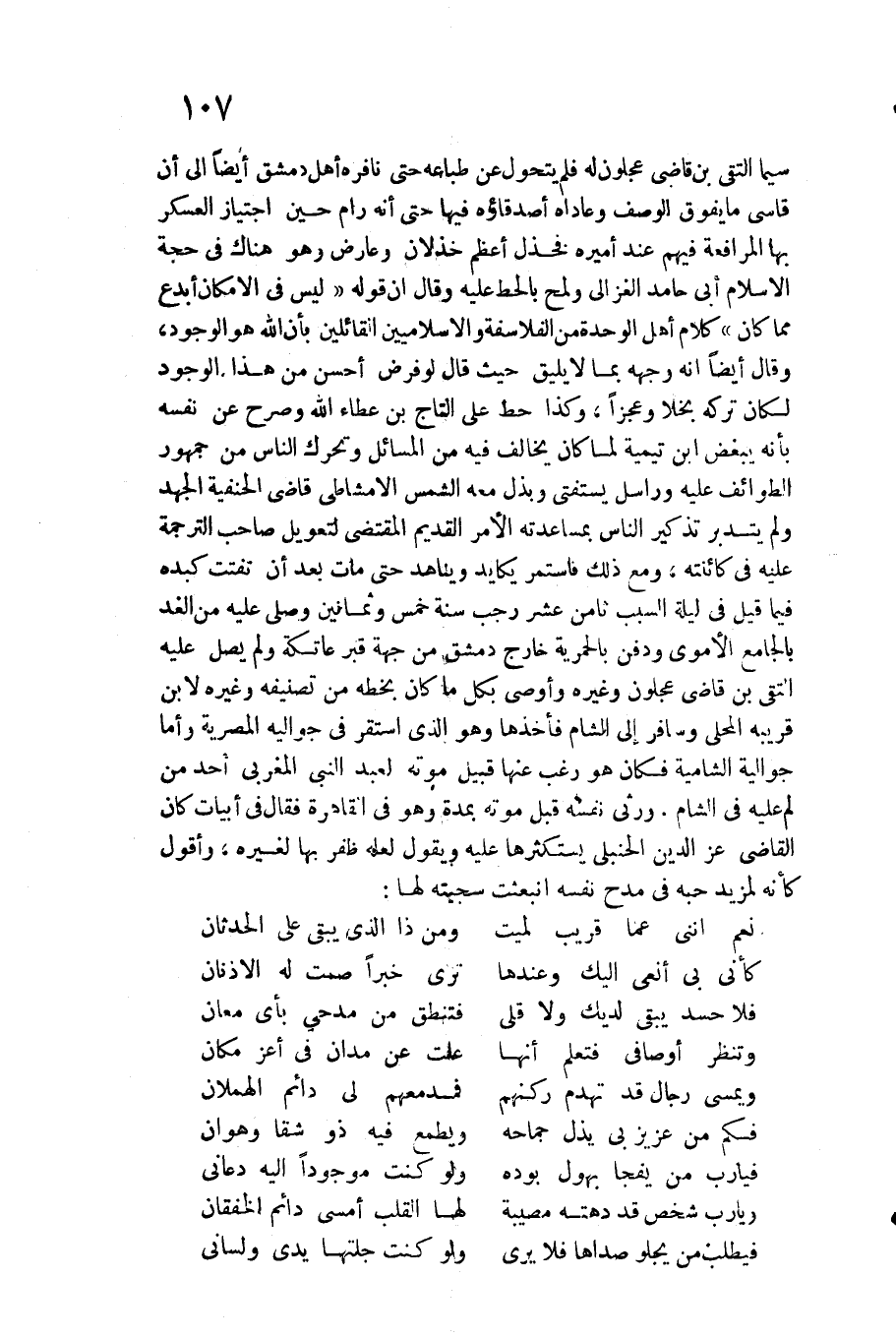 عجلون لَهُ فَلم يتَحَوَّل عَن طباعه حَتَّى نافره أهل دمشق أَيْضا إِلَى أَن قاسى مَا يفوق الْوَصْف وعاداه أصدقاؤه فِيهَا حَتَّى أَنه رام حِين اجتياز الْعَسْكَر بهَا المرافعة فيهم عِنْد أميره فخذل أعظم خذلان وعارض وَهُوَ هُنَاكَ فِي حجَّة الْإِسْلَام أبي حَامِد الْغَزالِيّ ولمح بالحط عَلَيْهِ وَقَالَ أَن قَوْله لَيْسَ فِي الْإِمْكَان أبدع مِمَّا كَانَ كَلَام أهل الْوحدَة من الفلاسفة والإسلاميين الْقَائِلين بِأَن الله هُوَ الْوُجُود وَقَالَ أَيْضا أَنه وَجهه بِمَا لَا يَلِيق حَيْثُ قَالَ لَو فرض أحسن من هَذَا الْوُجُود لَكَانَ تَركه بخلا وعجزا وَكَذَا حط على التَّاج بن عَطاء الله وَصرح عَن نَفسه بِأَنَّهُ يبغض ابْن تَيْمِية لما كَانَ يُخَالف فِيهِ من الْمسَائِل وتحرك النَّاس من جُمْهُور الطوائف عَلَيْهِ وراسل يستفتي وبذل مَعَه الشَّمْس الأمشاطي قَاضِي الْحَنَفِيَّة الْجهد وَلم يتدبر تذكير النَّاس بمساعدته الْأَمر الْقَدِيم الْمُقْتَضِي لتعويل صَاحب التَّرْجَمَة عَلَيْهِ فِي كائنته وَمَعَ ذَلِك فاستمر يكايد ويناهد حَتَّى مَاتَ بعد أَن تفتت كبده فِيمَا قيل فِي لَيْلَة السَّبَب ثامن عشر رَجَب سنة خمس وَثَمَانِينَ وَصلى عَلَيْهِ من الْغَد بالجامع الْأمَوِي وَدفن بالحمرية خَارج دمشق من جِهَة قبر عَاتِكَة وَلم يصل عَلَيْهِ التقي بن قَاضِي عجلون وَغَيره وَأوصى بِكُل مَا كَانَ بِخَطِّهِ من تصنيفه وَغَيره لِابْنِ قَرِيبه الْمحلى وسافر إِلَى الشَّام فَأَخذهَا وَهُوَ الَّذِي اسْتَقر فِي جواليه المصريه وَأما جوالية الشامية فَكَانَ هُوَ رغب عَنْهَا قبيل مَوته لعبد النَّبِي المغربي أحد من لم عَلَيْهِ فِي الشَّام.