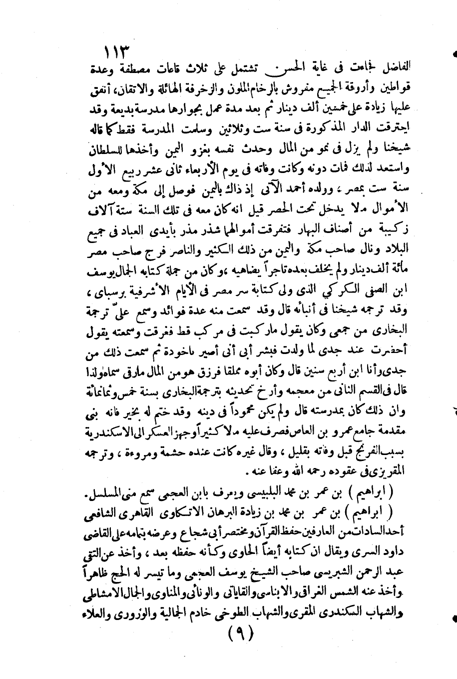 الْفَاضِل فَجَاءَت فِي غَايَة الْحسن تشْتَمل على ثَلَاث قاعات مصطفة وعدة قواطين وأروقة الْجَمِيع مفروش بالرخام الملون والزخرفة الهائلة والإتقان أنْفق عَلَيْهَا زِيَادَة على خمسين ألف دِينَار ثمَّ بعد مُدَّة عمل بجوارها مدرسة بديعة وَقد)