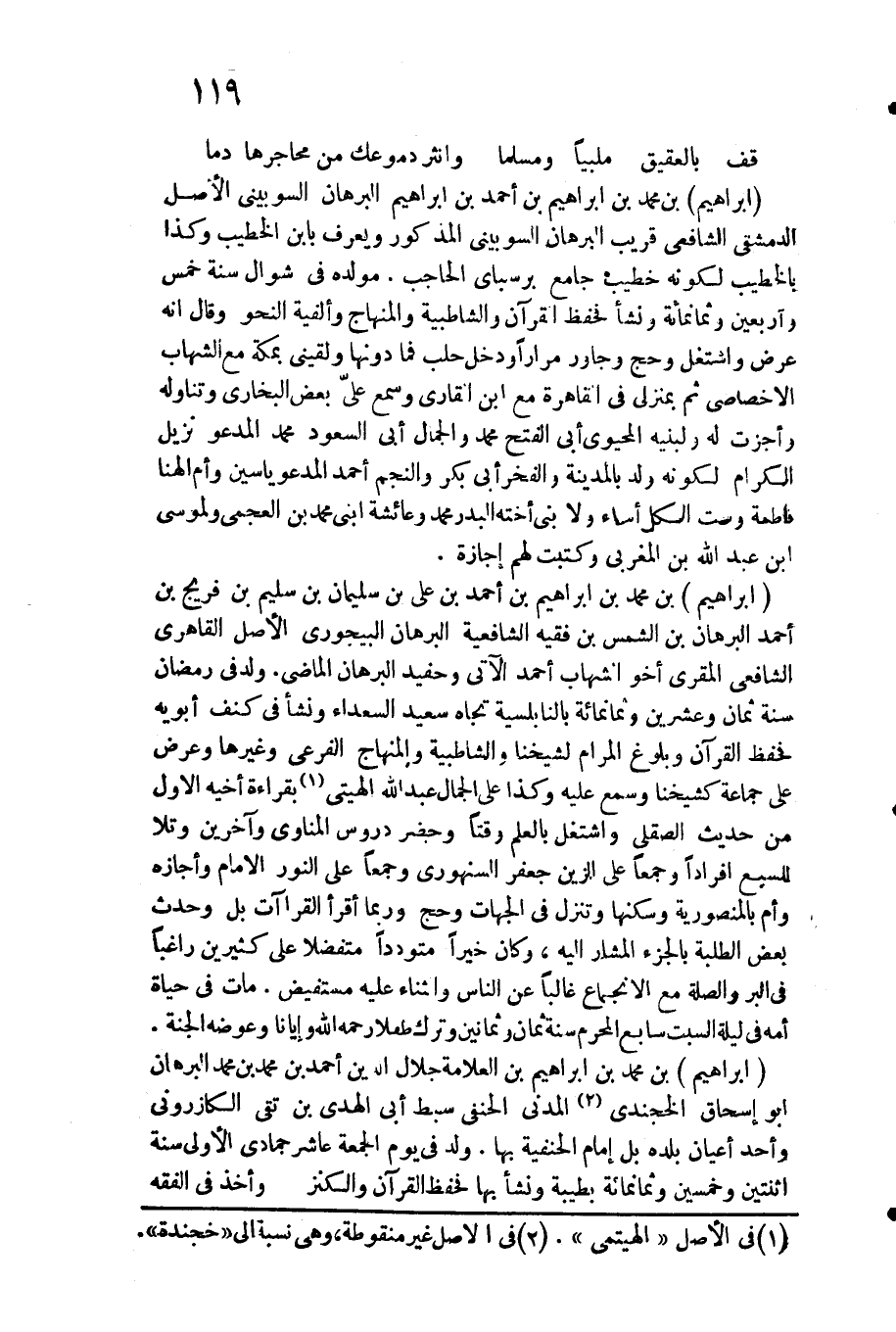 إِبْرَاهِيم بن مُحَمَّد بن إِبْرَاهِيم بن الْعَلامَة جلال الدّين أَحْمد بن مُحَمَّد بن مُحَمَّد الْبُرْهَان أَبُو إِسْحَاق الخجندي الْمدنِي الْحَنَفِيّ سبط أبي الْهدى بن تَقِيّ الكازروني وَأحد أَعْيَان بَلَده بل إِمَام الْحَنَفِيَّة بهَا. ولد فِي يَوْم الْجُمُعَة عَاشر جُمَادَى الأولى سنة اثْنَتَيْنِ وَخمسين وَثَمَانمِائَة بِطيبَة وَنَشَأ بهَا فحفظ الْقُرْآن والكنز وَأخذ فِي الْفِقْه
