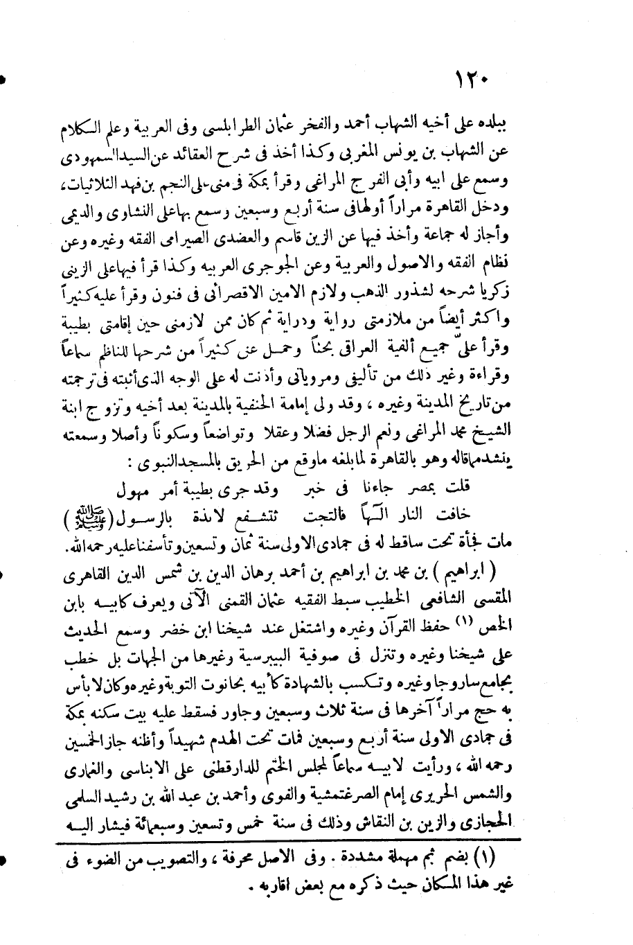 رِوَايَة ودراية ثمَّ كَانَ مِمَّن لازمني حِين إقامتي بِطيبَة وَقَرَأَ عَليّ جَمِيع ألفية الْعِرَاقِيّ بحثا وَحمل عني كثيرا من شرحها للناظم سَمَاعا وَقِرَاءَة وَغير ذَلِك من تأليفي ومروياتي وأذنت لَهُ على الْوَجْه الَّذِي أثْبته فِي تَرْجَمته من تَارِيخ الْمَدِينَة وَغَيره وَقد ولي إِمَامَة الْحَنَفِيَّة بِالْمَدِينَةِ بعد أَخِيه وَتزَوج ابْنة الشَّيْخ مُحَمَّد المراغي وَنعم الرجل فضلا وعقلا وتواضعا وسكونا وأصلا وسمعته ينشد مِمَّا قَالَه وَهُوَ بِالْقَاهِرَةِ لما بلغه مَا وَقع من الْحَرِيق بِالْمَسْجِدِ النَّبَوِيّ:
