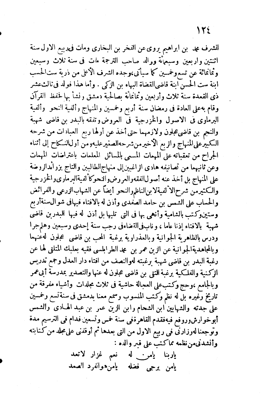 الْبرمَاوِيّ والخزرجية وَالْكثير من شرح الألفية لِابْنِ النَّاظِم والنحو أَيْضا عَن الشهَاب الزرعي والفرائض والحساب على الشَّمْس بن حَامِد الصَّفَدِي وَأذن لَهُ بالإفتاء فِيهَا فِي شَوَّال سنة أَربع وَسِتِّينَ وَكتب بالشامية وأنهى بهَا فِي الَّتِي تَلِيهَا بل أذن لَهُ فِيهَا الْبَدْر بن قَاضِي شُهْبَة بالإفتاء إِذْنا عَاما وناب فِي الْقَضَاء فِي رَجَب سنة إِحْدَى وَسبعين وهلم جرا ودرس بالظاهرية الجوانية وبالعذراوية برغبة الْمُحب بن قَاضِي عجلون لَهُ عَنْهُمَا وبالمجاهدية الجوانية عَن الزين عمر بن مُحَمَّد الطرابلسي فَقِيه بعلبك المتلقي لَهَا عَن رَغْبَة الْبَدْر بن قَاضِي شُهْبَة برغبته لَهُ وَالنّصف من إِفْتَاء دَار الْعدْل وَجمع تدريس الركنية والفلكية برغبة التقي بن قَاضِي عجلون لَهُ عَنْهَا والتصدير بمدرسة أبي عمر وبالجامع وَحج وَكتب على العجالة حَاشِيَة فِي ثَلَاث مجلدات وَأَشْيَاء مفرقة من تَارِيخ وَغَيره بل لَهُ نظم وَكتب الْمَنْسُوب وَسمع مَعنا بِدِمَشْق فِي سنة تسع وَخمسين على جدته والشهابين ابْن الشحام وَابْن الزين عمر بن عبد الْهَادِي وَالشَّمْس أَبُو خوارش وروفع فِيهِ فَقدم الْقَاهِرَة فِي سنة خمس وَتِسْعين فدام فِي الترسيم مُدَّة وتوجعنا لَهُ وزارني فِي ربيع الأول من الَّتِي بعْدهَا ثمَّ أوقفني على مُجَلد من كِتَابَته وأنشدني من نظمه مِمَّا كتب على قبر وَالِده: