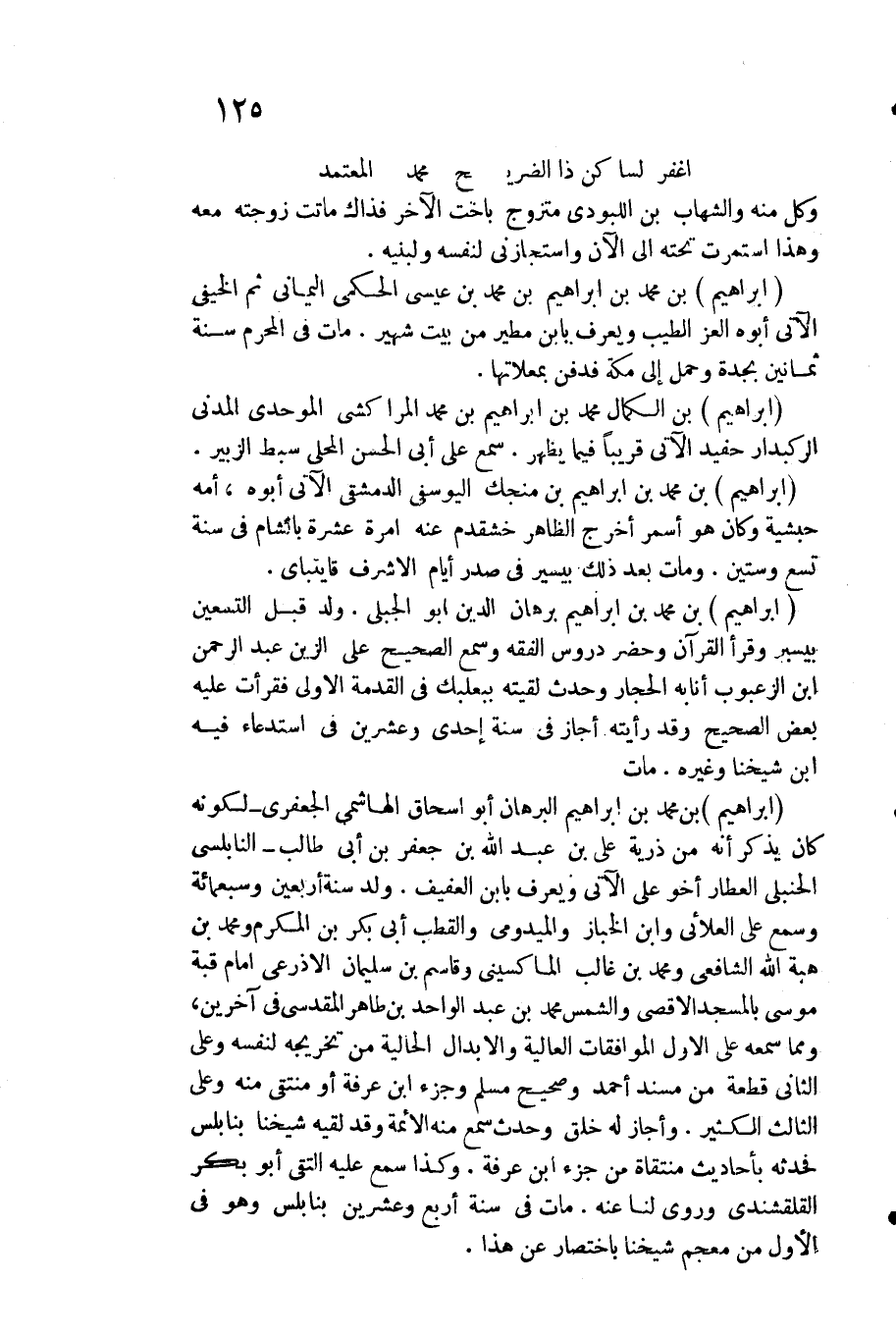 إِبْرَاهِيم بن مُحَمَّد بن إِبْرَاهِيم الْبُرْهَان أَبُو إِسْحَاق الْهَاشِمِي الْجَعْفَرِي لكَونه كَانَ يذكر أَنه من ذُرِّيَّة عَليّ بن عبد الله بن جَعْفَر بن أبي طَالب النابلسي الْحَنْبَلِيّ الْعَطَّار أَخُو عَليّ الْآتِي وَيعرف بِابْن الْعَفِيف. ولد سنة أَرْبَعِينَ وَسَبْعمائة وَسمع على العلائي وَابْن الخباز والميدومي والقطب أبي بكر بن المكرم وَمُحَمّد بن هبة الله الشَّافِعِي وَمُحَمّد بن غَالب الماكسيني وقاسم بن سُلَيْمَان الْأَذْرَعِيّ إِمَام قبَّة مُوسَى بِالْمَسْجِدِ الْأَقْصَى وَالشَّمْس مُحَمَّد بن عبد الْوَاحِد بن طَاهِر الْمَقْدِسِي فِي آخَرين وَمِمَّا سَمعه على الأول الموافقات الْعَالِيَة والأبدال الحالية من تَخْرِيجه لنَفسِهِ وعَلى الثَّانِي قِطْعَة من مُسْند أَحْمد وصحيح مُسلم وجزء ابْن عَرَفَة أَو منتقى مِنْهُ وعَلى الثَّالِث الْكثير. وَأَجَازَ لَهُ خلق وَحدث سمع مِنْهُ الْأَئِمَّة وَقد لقِيه شَيخنَا بنابلس فحدثه بِأَحَادِيث منتقاة من جُزْء ابْن عَرَفَة. وَكَذَا سمع عَلَيْهِ التقي أَبُو بكر القلقشندي وروى لنا عَنهُ. مَاتَ فِي سنة أَربع وَعشْرين بنابلس وَهُوَ فِي الأول من مُعْجم شَيخنَا بِاخْتِصَار عَن هَذَا.