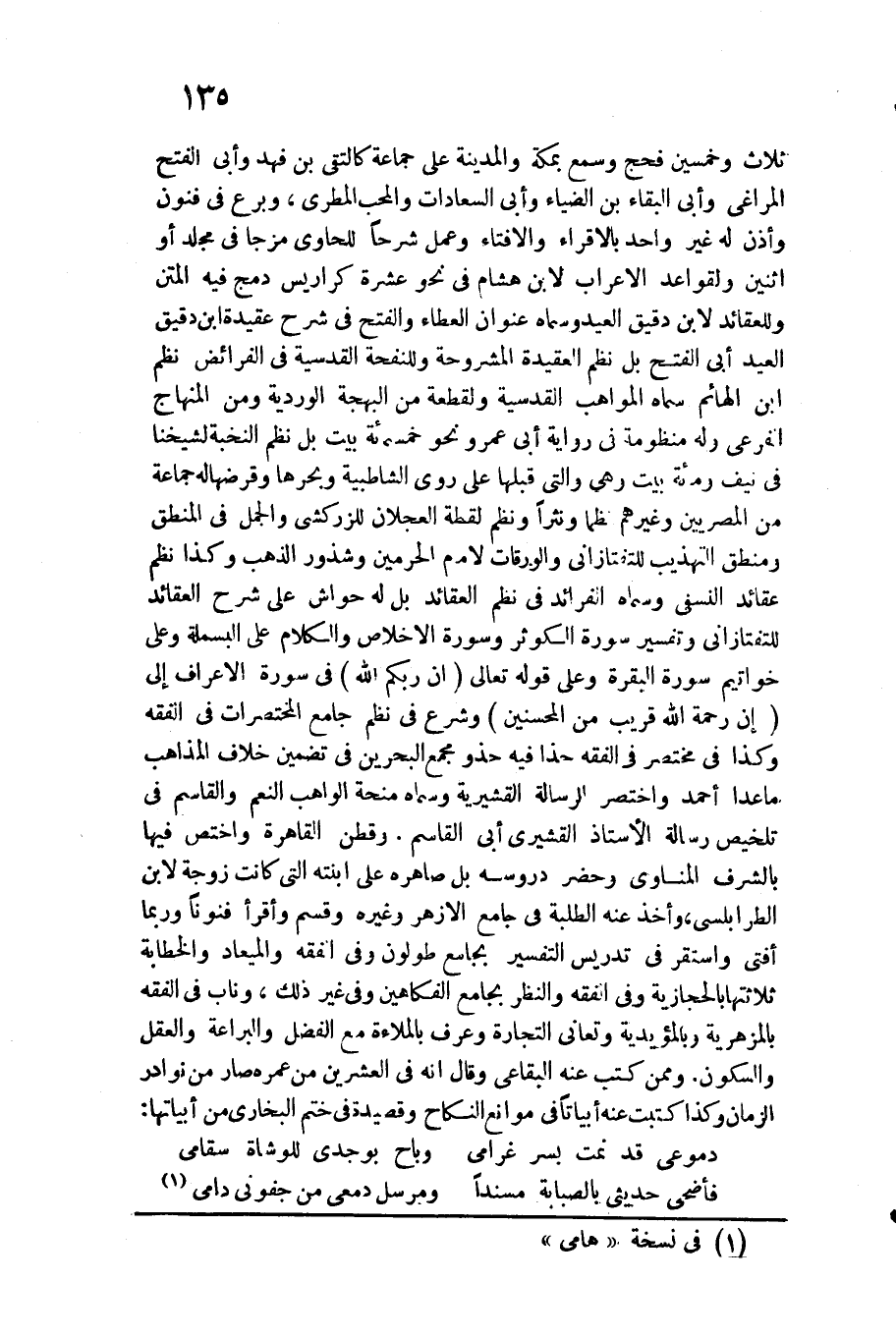 ثَلَاث وَخمسين فحج وَسمع بِمَكَّة وَالْمَدينَة على جمَاعَة كالتقي بن فَهد وَأبي الْفَتْح المراغي وَأبي الْبَقَاء بن الضياء وَأبي السعادات والمحب المطري وبرع فِي فنون وَأذن لَهُ غير وَاحِد بالإقراء والإفتاء وَعمل شرحا للحاوي مزجا فِي مُجَلد أَو اثْنَيْنِ ولقواعد الْإِعْرَاب لِابْنِ هِشَام فِي نَحْو عشرَة كراريس دمج فِيهِ الْمَتْن وللعقائد لِابْنِ دَقِيق الْعِيد وَسَماهُ عنوان الْعَطاء وَالْفَتْح فِي شرح عقيدة ابْن دَقِيق الْعِيد أبي الْفَتْح بل نظم العقيدة المشروحة وللنفحة القدسية فِي الْفَرَائِض نظم ابْن الهائم سَمَّاهُ الْمَوَاهِب القدسية ولقطعة من الْبَهْجَة الوردية وَمن الْمِنْهَاج الفرعي وَله منظومة فِي رِوَايَة أبي عَمْرو نَحْو خَمْسمِائَة بَيت بل نظم النخبة لشَيْخِنَا فِي نَيف ومئة بَيت وَهِي وَالَّتِي قبلهَا على روى الشاطبية وبحرها وقرضها لَهُ جمَاعَة من المصريين وَغَيرهم نظما ونثرا ونظم لقطَة العجلان للزركشي والجمل فِي الْمنطق ومنطق التَّهْذِيب للتفتازاني والورقات لإِمَام الْحَرَمَيْنِ وشذور الذَّهَب وَكَذَا نظم عقائد النَّسَفِيّ وَسَماهُ الفرائد فِي نظم العقائد بل لَهُ حواش على شرح العقائد للتفتازاني وَتَفْسِير سُورَة الْكَوْثَر وَسورَة الْإِخْلَاص وَالْكَلَام على الْبَسْمَلَة وعَلى خَوَاتِيم سُورَة الْبَقَرَة وعَلى قَوْله تَعَالَى إِن ربكُم الله فِي)