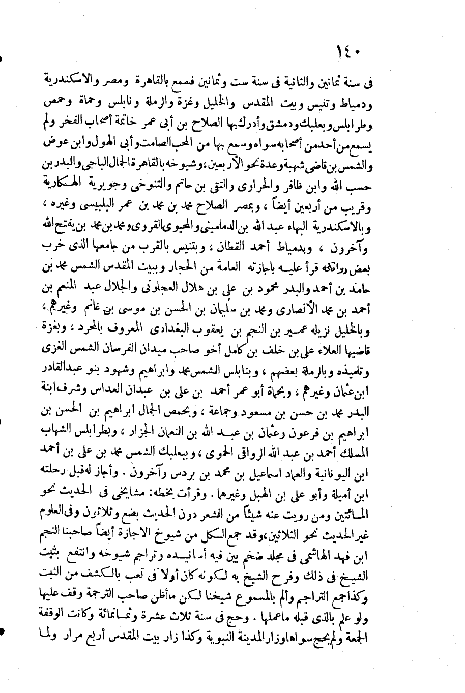 فِي سنة ثَمَانِينَ وَالثَّانيَِة فِي سنة سِتّ وَثَمَانِينَ فَسمع بِالْقَاهِرَةِ ومصر والاسكندرية ودمياط وتنيس وَبَيت الْمُقَدّس والخليل وغزة والرملة ونابلس وحماة وحمص وطرابلس وبعلبك ودمشق وَأدْركَ بهَا الصّلاح بن أبي عمر خَاتِمَة أَصْحَاب الْفَخر وَلم يسمع من أحد من أَصْحَابه سواهُ وَسمع بهَا من الْمُحب الصَّامِت وَأبي الهول وَابْن عوض وَالشَّمْس بن قَاضِي شُهْبَة وعدة نَحْو الْأَرْبَعين وشيوخه بِالْقَاهِرَةِ الْجمال الْبَاجِيّ والبدر بن حسب الله وَابْن ظافر والحراوي والتقي بن حَاتِم والتنوخي وَجُوَيْرِية الهكارية وَقَرِيب من أَرْبَعِينَ أَيْضا وبمصر الصّلاح مُحَمَّد بن مُحَمَّد بن عمر البلبيسي وَغَيره وبالاسكندرية الْبَهَاء عبد الله بن الدماميني والمحيوي الْقَرَوِي وَمُحَمّد بن مُحَمَّد بن يفتح الله وَآخَرُونَ وبدمياط أَحْمد الْقطَّان وبتنيس بِالْقربِ من جَامعهَا الَّذِي خرب بعض رفقائه قَرَأَ عَلَيْهِ بإجازته الْعَامَّة من الحجار وببيت الْمُقَدّس الشَّمْس مُحَمَّد بن حَامِد بن أَحْمد والبدر مَحْمُود بن عَليّ بن هِلَال العجلوني والجلال عبد الْمُنعم بن أَحْمد بن مُحَمَّد الْأنْصَارِيّ وَمُحَمّد بن سُلَيْمَان بن الْحسن بن مُوسَى بن غَانِم وَغَيرهم وبالخليل نزيله عُمَيْر بن النَّجْم بن يَعْقُوب الْبَغْدَادِيّ الْمَعْرُوف بالمحرد وبغزة قاضيها الْعَلَاء عَليّ بن خلف بن كَامِل أَخُو صَاحب ميدان)