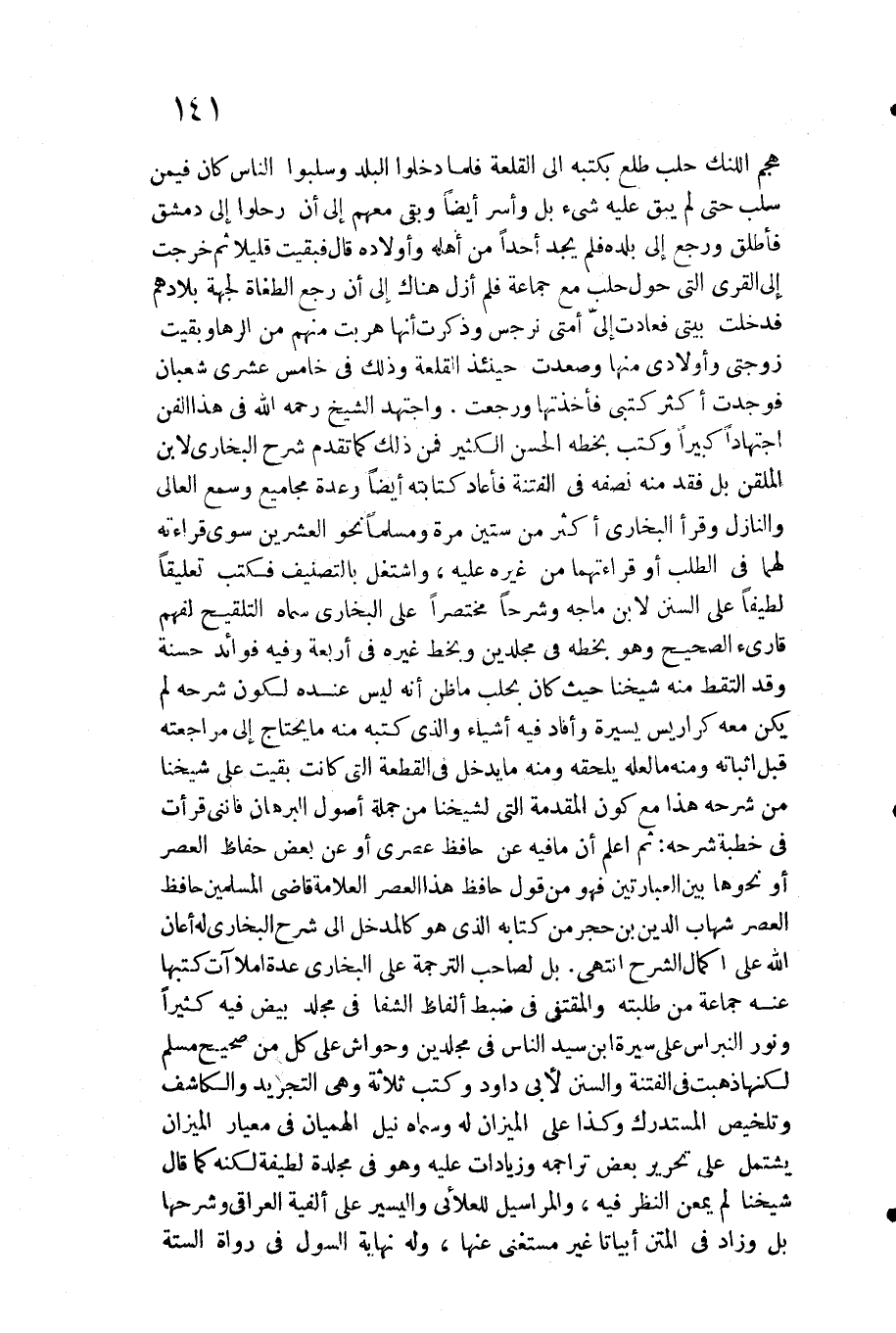 هجم اللنك حلب طلع بكتبه إِلَى القلعة فَلَمَّا دخلُوا الْبَلَد وسلبوا النَّاس كَانَ فِيمَن سلب حَتَّى لم يبْق عَلَيْهِ شَيْء بل وَأسر أَيْضا وَبَقِي مَعَهم إِلَى أَن رحلوا إِلَى دمشق فَأطلق وَرجع إِلَى بَلَده فَلم يجد أحدا من أَهله وَأَوْلَاده قَالَ فَبَقيت قَلِيلا ثمَّ خرجت إِلَى الْقرى الَّتِي حول حلب مَعَ جمَاعَة فَلم أزل هُنَاكَ إِلَى أَن رَجَعَ الطغاة لجِهَة بِلَادهمْ فَدخلت بَيْتِي فَعَادَت إِلَيّ أمتِي نرجس وَذكرت أَنَّهَا هربت مِنْهُم من الرها وَبقيت زَوْجَتي وأولادي مِنْهَا وصعدت حِينَئِذٍ القلعة وَذَلِكَ فِي خَامِس عشري شعْبَان فَوجدت أَكثر كتبي فأخذتها وَرجعت.