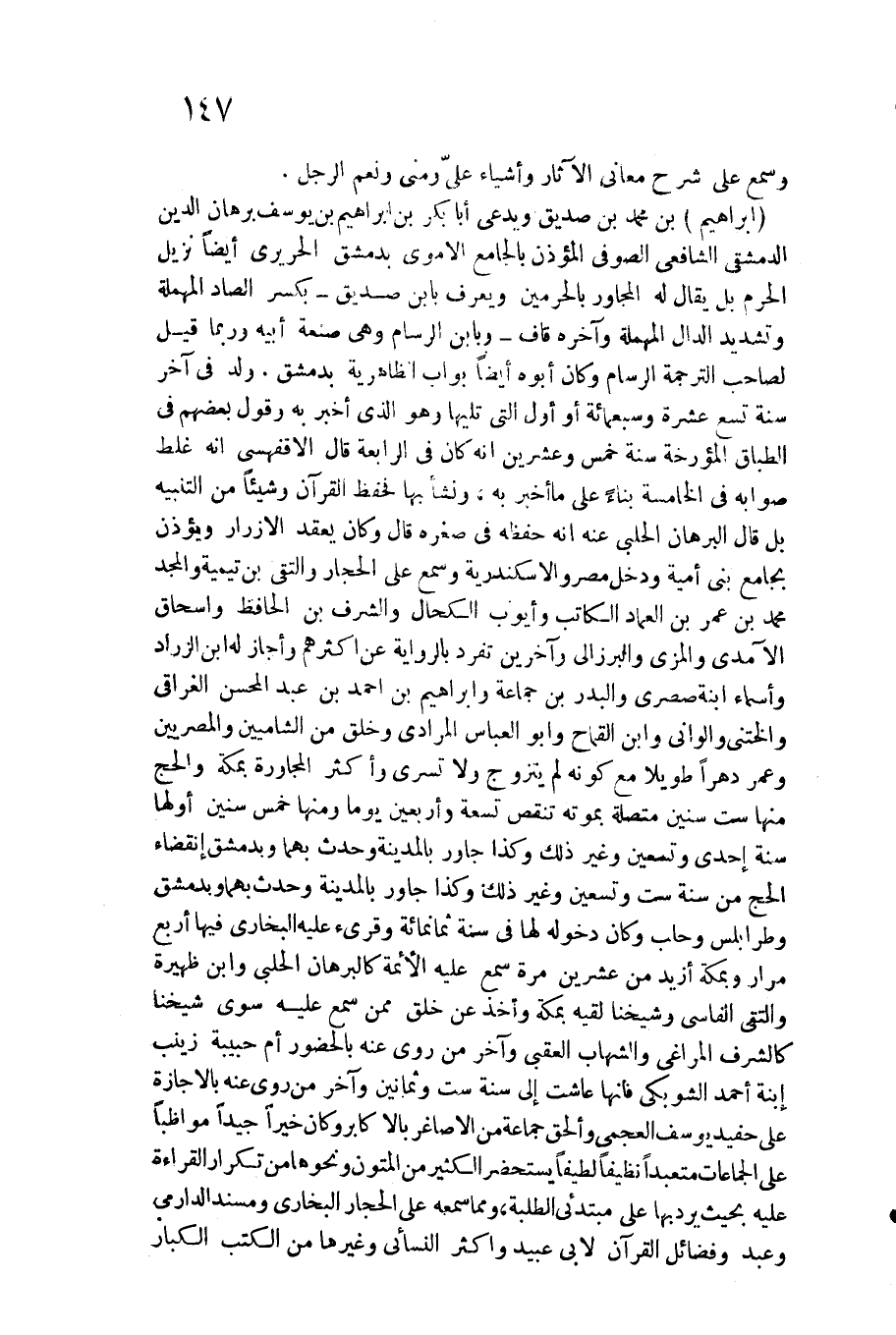 إِبْرَاهِيم بن مُحَمَّد بن صديق ويدعى أَبَا بكر بن إِبْرَاهِيم بن يُوسُف برهَان الدّين الدِّمَشْقِي الشَّافِعِي الصُّوفِي الْمُؤَذّن بالجامع الْأمَوِي بِدِمَشْق الحريري أَيْضا نزيل الْحرم بل يُقَال لَهُ المجاور بالحرمين وَيعرف بِابْن صديق بِكَسْر الصَّاد الْمُهْملَة وَتَشْديد الدَّال الْمُهْملَة وَآخره قَاف وبابن الرسام وَهِي صَنْعَة أَبِيه وَرُبمَا قيل لصَاحب التَّرْجَمَة الرسام وَكَانَ أَبوهُ أَيْضا بواب الظَّاهِرِيَّة بِدِمَشْق. ولد فِي آخر سنة تسع عشرَة وَسَبْعمائة أَو أول الَّتِي تَلِيهَا وَهُوَ الَّذِي أخبر بِهِ وَقَول بَعضهم فِي الطباق المؤرخة سنة خمس وَعشْرين أَنه كَانَ فِي الرَّابِعَة قَالَ الأقفهسي أَنه غلط صَوَابه فِي الْخَامِسَة بِنَاء على مَا أخبر بِهِ وَنَشَأ بهَا فحفظ الْقُرْآن وشيئا من التَّنْبِيه بل قَالَ الْبُرْهَان الْحلَبِي عَنهُ أَنه حفظه فِي صغره قَالَ وَكَانَ يعْقد الأزرار وَيُؤذن بِجَامِع بني أُميَّة وَدخل مصر والاسكندرية وَسمع على الحجار والتقي بن تَيْمِية وَالْمجد مُحَمَّد بن عمر بن الْعِمَاد الْكَاتِب وَأَيوب الكحال والشرف بن الْحَافِظ وَإِسْحَاق الْآمِدِيّ والمزي والبرزالي وَآخَرين تفرد بالرواية عَن أَكْثَرهم وَأَجَازَ لَهُ ابْن الزراد وَأَسْمَاء ابْنة صصرى والبدر بن جمَاعَة وَإِبْرَاهِيم بن أَحْمد بن عبد المحسن الغراقي والختني والواني وَابْن القماح وَأَبُو الْعَبَّاس الْمرَادِي وَخلق من الشاميين والمصريين وَعمر دهرا طَويلا مَعَ كَونه لم يتَزَوَّج وَلَا تسري وَأكْثر الْمُجَاورَة بِمَكَّة وَالْحج مِنْهَا سِتّ سِنِين مُتَّصِلَة بِمَوْتِهِ تنقص تِسْعَة وَأَرْبَعين يَوْمًا وَمِنْهَا خمس سِنِين أَولهَا سنة إِحْدَى وَتِسْعين وَغير ذَلِك وَكَذَا جاور بِالْمَدِينَةِ وَحدث بهما وبدمشق انْقِضَاء الْحَج من سنة سِتّ وَتِسْعين وَغير ذَلِك وَكَذَا جاور بِالْمَدِينَةِ وَحدث بهما وبدمشق وطرابلس وحلب وَكَانَ دُخُوله لَهَا فِي سنة ثَمَانمِائَة وَقُرِئَ عَلَيْهِ البُخَارِيّ فِيهَا أَربع مرار وبمكة أَزِيد من عشْرين مرّة سمع عَلَيْهِ الْأَئِمَّة كالبرهان الْحلَبِي وَابْن ظهيرة والتقي الفاسي وَشَيخنَا لقِيه بِمَكَّة وَأخذ عَن خلق مِمَّن سمع عَلَيْهِ سوى شَيخنَا كالشرف المراغي والشهاب العقبي وَآخر من روى عَنهُ بالحضور أم حَبِيبَة زَيْنَب ابْنة أَحْمد الشوبكي فَإِنَّهَا عاشت إِلَى سنة سِتّ وَثَمَانِينَ وَآخر من روى عَنهُ بِالْإِجَازَةِ على حفيد يُوسُف العجمي وَألْحق جمَاعَة من الأصاغر)