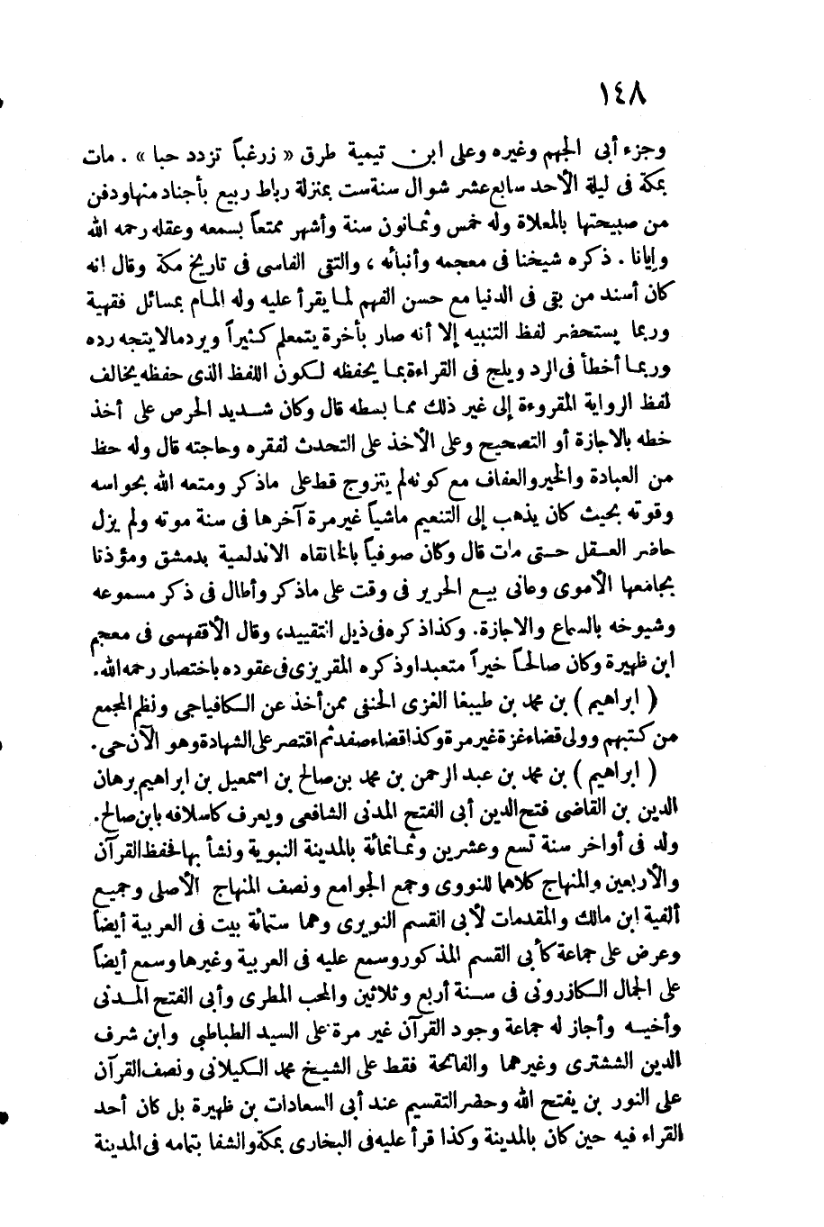 وجزء أبي الجهم وَغَيره وعَلى ابْن تَيْمِية طرق زرغبا تَزْدَدْ حبا. مَاتَ بِمَكَّة فِي لَيْلَة الْأَحَد سَابِع عشر شَوَّال سنة سِتّ بِمَنْزِلَة رِبَاط ربيع بأجناد مِنْهَا وَدفن من صبيحتها بالمعلاة وَله خمس وَثَمَانُونَ سنة وَأشهر ممتعا بسمعه وعقله رَحمَه الله وإيانا. ذكره شَيخنَا فِي مُعْجَمه وأنبائه والتقي الفاسي فِي تَارِيخ مَكَّة وَقَالَ أَنه كَانَ أسْند من بَقِي فِي الدُّنْيَا مَعَ حسن الْفَهم لما يقْرَأ عَلَيْهِ وَله إِلْمَام بمسائل فقهية وَرُبمَا يستحضر لفظ التَّنْبِيه إِلَّا أَنه صَار بِأخرَة يتَعَلَّم كثيرا وَيرد مَا لَا يتَّجه رده وَرُبمَا أَخطَأ فِي الرَّد ويلج فِي الْقِرَاءَة بِمَا يحفظه لكَون اللَّفْظ الَّذِي حفظه يُخَالف لفظ الرِّوَايَة المقروءة إِلَى غير ذَلِك مِمَّا بَسطه قَالَ وَكَانَ شَدِيد الْحِرْص على أَخذ خطه بِالْإِجَازَةِ أَو التَّصْحِيح وعَلى الْأَخْذ على التحدث لفقره وَحَاجته قَالَ وَله حَظّ من الْعِبَادَة وَالْخَيْر والعفاف مَعَ كَونه لم يتَزَوَّج قطّ على مَا ذكر ومتعه الله بحواسه وقوته بِحَيْثُ كَانَ يذهب إِلَى التَّنْعِيم مَاشِيا غير مرّة آخرهَا فِي سنة مَوته وَلم يزل حَاضر الْعقل حَتَّى مَاتَ قَالَ وَكَانَ صوفيا بالخانقاه الأندلسية بِدِمَشْق ومؤذنا بجامعها الْأمَوِي وعانى بيع الْحَرِير فِي وَقت على مَا ذكر وَأطَال فِي ذكر مسموعه وشيوخه بِالسَّمَاعِ وَالْإِجَازَة. وَكَذَا ذكره فِي ذيل التَّقْيِيد وَقَالَ الأقفهسي فِي مُعْجم ابْن ظهيرة وَكَانَ صَالحا خيرا متعبدا وَذكره المقريزي فِي عقوده بِاخْتِصَار رَحمَه الله.