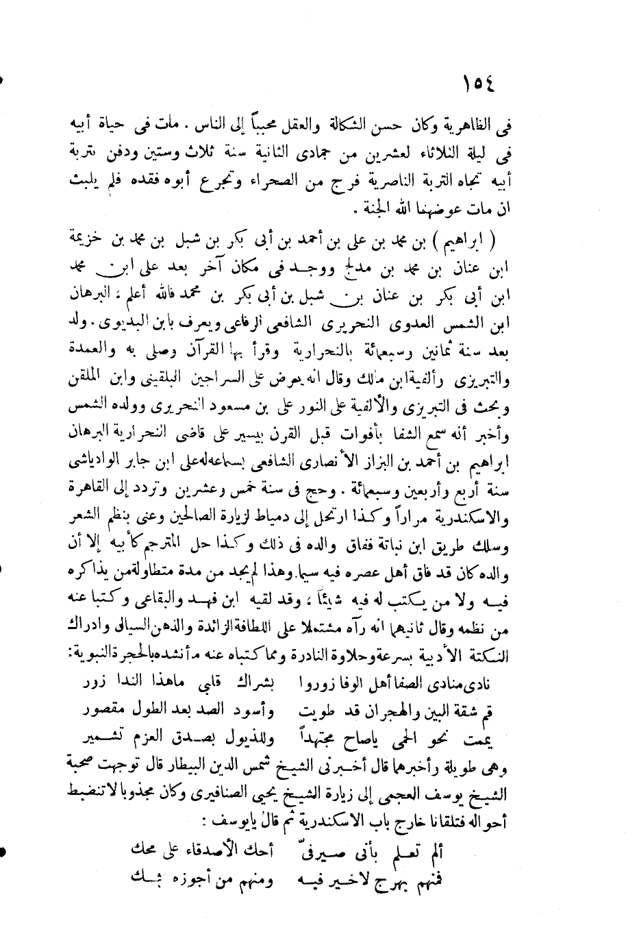 إِبْرَاهِيم بن مُحَمَّد بن عَليّ بن أَحْمد بن أبي بكر بن شبْل بن مُحَمَّد بن خُزَيْمَة بن عنان بن مُحَمَّد بن مُدْلِج وَوجد فِي مَكَان آخر بعد عَليّ ابْن مُحَمَّد بن أبي بكر بن عنان بن شبْل بن أبي بكر بن مُحَمَّد فَالله أعلم. الْبُرْهَان بن الشَّمْس الْعَدوي النحريري الشَّافِعِي الرِّفَاعِي وَيعرف بِابْن البديوي. ولد بعد سنة ثَمَانِينَ وَسَبْعمائة بالنحرارية وَقَرَأَ بهَا الْقُرْآن وَصلى بِهِ والعمدة والتبريزي وألفية ابْن مَالك وَقَالَ أَنه يعرض على السراجين البُلْقِينِيّ وَابْن الملقن وَبحث فِي التبريزي والألفية على النُّور عَليّ بن مَسْعُود النحريري وَولده الشَّمْس وَأخْبر أَنه سمع الشفا بأفوات قبل الْقرن بِيَسِير على قَاضِي النحرارية الْبُرْهَان إِبْرَاهِيم بن أَحْمد بن الْبَزَّاز الْأنْصَارِيّ الشَّافِعِي بِسَمَاعِهِ لَهُ على ابْن جَابر الوادياشي سنة أَربع وَأَرْبَعين وَسَبْعمائة. وَحج فِي سنة خمس وَعشْرين وَتردد إِلَى الْقَاهِرَة والاسكندرية مرَارًا وَكَذَا ارتحل إِلَى دمياط لزيارة الصَّالِحين وعني بنظم الشّعْر وسلك طَرِيق ابْن نباتة ففاق وَالِده فِي ذَلِك وَكَذَا حل المترجم كأبيه إِلَّا أَن وَالِده كَانَ قد فاق أهل عصره فِيهِ سِيمَا وَهَذَا لم يجد من مُدَّة متطاولة من يذاكره فِيهِ وَلَا من يكْتب لَهُ فِيهِ شَيْئا وَقد لقِيه ابْن فَهد والبقاعي وكتبا عَنهُ من نظمه وَقَالَ ثَانِيهمَا أَنه رَآهُ مُشْتَمِلًا على اللطافة الزَّائِدَة والذهن السيال وَإِدْرَاك النُّكْتَة الأدبية بِسُرْعَة وحلاوة النادرة وَمِمَّا كتباه عَنهُ مَا أنْشدهُ بالحجرة النَّبَوِيَّة: