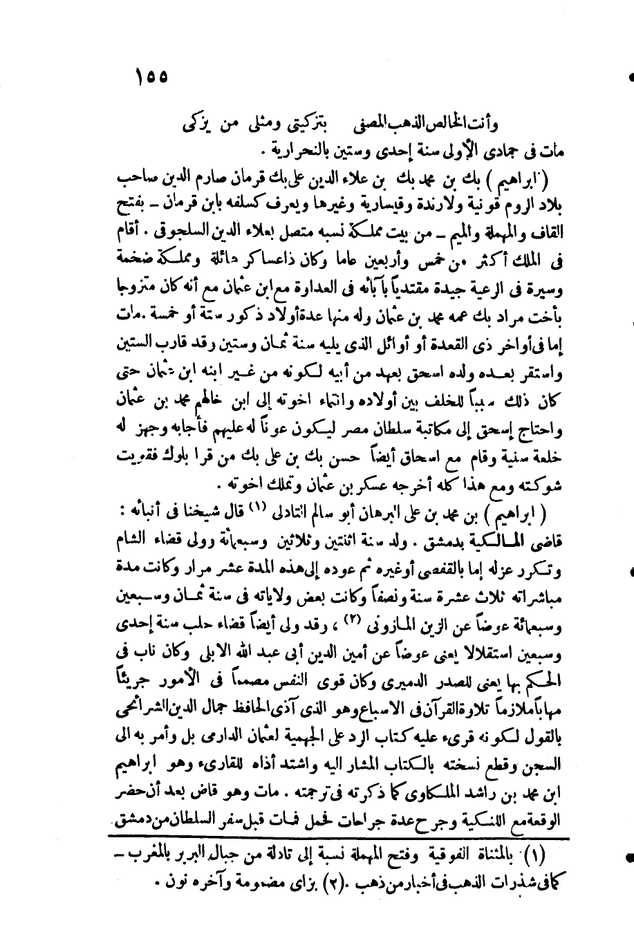 إِبْرَاهِيم بك بن مُحَمَّد بك بن عَلَاء الدّين عَليّ بك قرمان صارم الدّين صَاحب بِلَاد الرّوم قونية ولارندة وقيسارية وَغَيرهَا وَيعرف كسلفه بِابْن قرمان بِفَتْح الْقَاف والمهملة وَالْمِيم من بَيت مملكة نسبه مُتَّصِل بعلاء الدّين السلجوقي. أَقَامَ فِي الْملك أَكثر من خمس وَأَرْبَعين عَاما وَكَانَ ذَا عَسَاكِر هائلة ومملكة ضخمة وسيرة فِي الرّعية جَيِّدَة مقتديا بآبائه فِي الْعَدَاوَة مَعَ ابْن عُثْمَان مَعَ أَنه كَانَ متزوجا بأخت مُرَاد بك عَمه مُحَمَّد بن عُثْمَان وَله مِنْهَا عدَّة أَوْلَاد ذُكُور سِتَّة أَو خَمْسَة. مَاتَ إِمَّا فِي أَوَاخِر ذِي الْقعدَة أَو أَوَائِل الَّذِي يَلِيهِ سنة ثَمَان وَسِتِّينَ وَقد قَارب السِّتين وَاسْتقر بعده وَلَده إِسْحَاق بِعَهْد من أَبِيه لكَونه من غير ابْنه ابْن عُثْمَان حَتَّى كَانَ ذَلِك سَببا للخلف بَين أَوْلَاده وانتماء أخوته إِلَى ابْن خالهم مُحَمَّد بن عُثْمَان وَاحْتَاجَ إِسْحَاق إِلَى مُكَاتبَة سُلْطَان مصر ليَكُون عونا لَهُ عَلَيْهِم فَأَجَابَهُ وجهز لَهُ خلعة سنية وَقَامَ مَعَ إِسْحَاق أَيْضا حسن بك بن عَليّ بك من قرا بلوك فَقَوِيت شوكته وَمَعَ هَذَا كُله أخرجه عَسْكَر بن عُثْمَان وتملك أخوته.