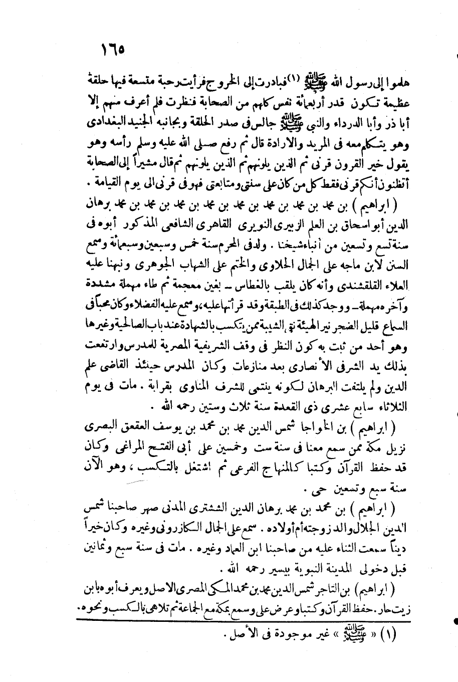 هلموا إِلَى رَسُول الله صلى الله عَلَيْهِ وَسلم فبادرت إِلَى الْخُرُوج فَرَأَيْت رحبة متسعة فِيهَا حَلقَة عَظِيمَة تكون قدر أَرْبَعمِائَة نفس كلهم من الصَّحَابَة فَنَظَرت فَلم أعرف مِنْهُم إِلَّا أَبَا ذَر وَأَبا الدَّرْدَاء وَالنَّبِيّ صلى الله عَلَيْهِ وَسلم جَالس فِي صدر الْحلقَة وبجانبه الْجُنَيْد الْبَغْدَادِيّ وَهُوَ يتَكَلَّم مَعَه فِي المريد والارادة قَالَ ثمَّ رفع صلى الله عَلَيْهِ وَسلم رَأسه وَهُوَ يَقُول خير الْقُرُون قَرْني ثمَّ الَّذين يَلُونَهُمْ ثمَّ الَّذين يَلُونَهُمْ ثمَّ قَالَ مُشِيرا إِلَى الصَّحَابَة أتظنون أَنكُمْ قَرْني فَقَط كل من كَانَ على سنتي ومتابعتي فَهُوَ فِي قَرْني إِلَى يَوْم الْقِيَامَة.)