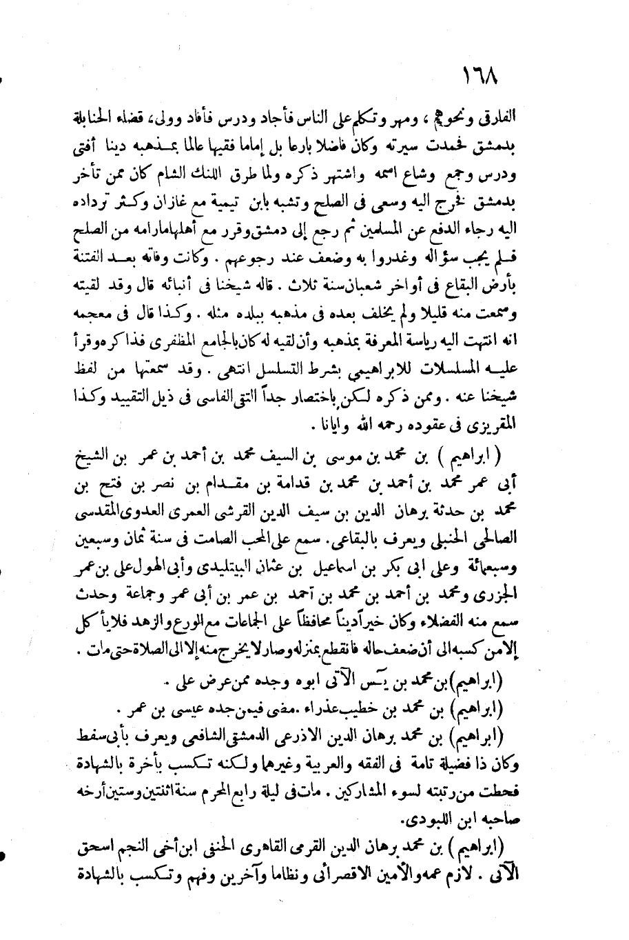 الفارقي وَنَحْوهم وَمهر وَتكلم على النَّاس فاجاد ودرس فَأفَاد وَولي قَضَاء الْحَنَابِلَة بِدِمَشْق فحمدت سيرته وَكَانَ فَاضلا بارعا بل إِمَامًا فَقِيها عَالما بمذهبه دينا أفتى ودرس وَجمع وشاع اسْمه واشتهر ذكره وَلما طرق اللنك الشَّام كَانَ مِمَّن تَأَخّر بِدِمَشْق فَخرج إِلَيْهِ وسعى فِي الصُّلْح وتشبه بِابْن تَيْمِية مَعَ غازان وَكثر ترداده إِلَيْهِ رَجَاء الدّفع عَن الْمُسلمين ثمَّ رَجَعَ إِلَى دمشق وَقرر مَعَ أَهلهَا مَا رامه من الصُّلْح فَلم يجب سُؤَاله وغدروا بِهِ وَضعف عِنْد رجوعهم. وَكَانَت وَفَاته بعد الْفِتْنَة بِأَرْض الْبِقَاع فِي أَوَاخِر شعْبَان سنة ثَلَاث. قَالَه شَيخنَا فِي أنبائه قَالَ وَقد لَقيته وَسمعت مِنْهُ قَلِيلا وَلم يخلف بعده فِي مذْهبه بِبَلَدِهِ مثله. وَكَذَا قَالَ فِي مُعْجَمه أَنه انْتَهَت إِلَيْهِ رياسة الْمعرفَة بمذهبه وَأَن لقِيه لَهُ كَانَ بالجامع المظفري فذاكره وَقَرَأَ عَلَيْهِ المسلسلات للابراهيمي بِشَرْط التسلسل انْتهى. وَقد سَمعتهَا من لفظ شَيخنَا عَنهُ. وَمِمَّنْ ذكره لَكِن بِاخْتِصَار جدا التقى الفاسي فِي ذيل التَّقْيِيد وَكَذَا المقريزي فِي عقوده رَحمَه الله وايانا.