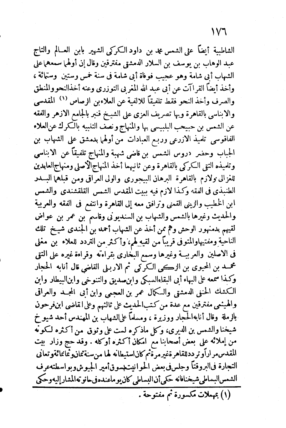 الشاطبية أَيْضا على الشَّمْس مُحَمَّد بن دَاوُد الكركي الشهير بِابْن الْعَالم والتاج عبد الْوَهَّاب بن يُوسُف بن السلار الدِّمَشْقِي مفترقين وَقَالَ إِن أَولهمَا سمعهما على الشهَاب أبي شامة وَهُوَ عَجِيب فوفاة أبي شامة فِي سنة خمس وَسِتِّينَ وسِتمِائَة وَأخذ أَيْضا الْقرَاءَات عَن أبي عبد الله المغربي التوزري وَعنهُ أَخذ النَّحْو والمنطق وَالصرْف وَأخذ النَّحْو فَقَط تلفيقا للألفية عَن الْعَلَاء بن الرصاص الْمَقْدِسِي والأبناسي بِالْقَاهِرَةِ وَبهَا تصريف الْعُزَّى على الشَّيْخ قنبر بالجامع الْأَزْهَر وَالْفِقْه عَن الشَّمْس بن حبيبحب البلبيسي بهَا والمنهاج وَنصف التَّنْبِيه بالكرك عَن الْعَلَاء الفاقوسي تلميذ الأزرعي وَربع الْعِبَادَات من أَولهمَا بِدِمَشْق على الشهَاب بن الْجبَاب وَحضر دروس الشَّمْس بن قَاضِي شُهْبَة والمنهاج تلفيقا عَن الأبناسي وتلميذه التقي الكركي بِالْقَاهِرَةِ وَعَن ثَانِيهمَا أَخذ الْمِنْهَاج الْأَصْلِيّ ومنهاج العابدين للغزالي ولازم بِالْقَاهِرَةِ الْبُرْهَان البيجوري وَالْوَلِيّ الْعِرَاقِيّ وَمن قبلهمَا الْبَدْر الطنبذي فِي الْفِقْه وَكَذَا لَازم فِيهِ بِبَيْت الْمُقَدّس الشَّمْس القلقشندي وَالشَّمْس بن الْخَطِيب والزيني القمني وترافق مَعَه إِلَى الْقَاهِرَة وانتفع فِي الْفِقْه والعربية والْحَدِيث وَغَيرهَا بالشمس والشهاب بن السنديوني وقاسم بن عمر بن عواض لَقِيَهُمْ بدمنهور الْوَحْش وهم مِمَّن أَخذ عَن الشهَاب أَحْمد بن الجندي شيخ تِلْكَ النَّاحِيَة ومفتيها والمتوفي قَرِيبا من لقِيه لَهُم وَأكْثر من التَّرَدُّد للعلاء بن مغلى فِي الْأَصْلَيْنِ والعربية وَغَيرهَا وَسمع البُخَارِيّ بقرَاءَته وَقِرَاءَة غَيره على التقي مُحَمَّد بن المحيوي بن الزكي الكركي ثمَّ الأربلي القَاضِي قَالَ أنابه الحجار وَكَذَا سَمعه على الْبَهَاء أبي الْبَقَاء السُّبْكِيّ وَابْن صديق والتنوخي وَابْن البيطار وَابْن الكشك الْحَنَفِيّ الدِّمَشْقِي والكمال عمر بن العجمي وَابْن أبي الْمجد والعراقي والهيثمي مفترقين مَعَ عدَّة من كتب الحَدِيث على ثالثهم وعَلى)