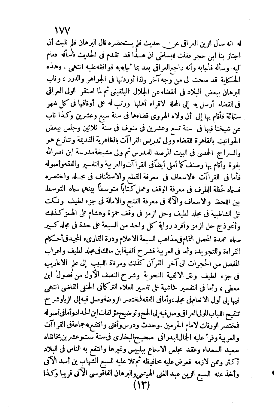 وَهَذِه الْحِكَايَة قد صحت لي من وَجه آخر وَلذَا أوردتها فِي الْجَوَاهِر والدرر وناب الْبُرْهَان بِبَعْض الْبِلَاد فِي الْقَضَاء عَن الْجلَال البُلْقِينِيّ ثمَّ لما اسْتَقر الْوَلِيّ الْعِرَاقِيّ فِي الْقَضَاء أرسل بِهِ إِلَى الْمحلة لإقراء أَهلهَا ورتب لَهُ على أوقافها فِي كل شهر سِتّمائَة فَأَقَامَ بهَا إِلَى أَن ولاه الْهَرَوِيّ قضاءها فِي سنة سبع وَعشْرين وَكَذَا نَاب عَن شَيخنَا فِيهَا فِي سنة تسع وَعشْرين فِي منوف فِي سنة ثَلَاثِينَ وَجلسَ بِبَعْض الحوانيت بِالْقَاهِرَةِ للْقَضَاء وَولي تدريس الْقرَاءَات بالظاهرية الْقَدِيمَة وتنازع هُوَ والسراج الْحِمصِي فِي الْبَيْت المرصد للمدرس ثمَّ ولي مشيخة مدرسة ابْن نصر الله بفوة وَأقَام بهَا وصنف كَمَا أملي أَيْضا فِي الْقرَاءَات والعربية وَالتَّفْسِير وَالْفِقْه وأصوله فَأَما فِي الْقرَاءَات فالإسعاف فِي معرفَة الْقطع والاستئناف فِي مُجَلد وَاخْتَصَرَهُ فَسَماهُ لَحْظَة الطّرف فِي معرفَة الْوَقْف وَعمل كتابا متوسطا بَينهمَا سَمَّاهُ التَّوَسُّط بَين اللحظ والإسعاف والآلة فِي معرفَة الْفَتْح والإمالة فِي جُزْء لطيف ونكت على الشاطبية فِي مُجَلد لطيف وَحل الرَّمْز فِي وقف حَمْزَة وَهِشَام على الْهَمْز كَذَلِك وأنموذج حل الرَّمْز وأفرد رِوَايَة كل وَاحِد من السَّبْعَة على حِدة فِي مُجَلد كَبِير سَمَّاهُ عُمْدَة المحصل التَّمام فِي مَذَاهِب السَّبْعَة الْأَعْلَام ودرة الْقَارئ الْمجِيد فِي أَحْكَام الْقِرَاءَة والتجويد وَأما فِي الْعَرَبيَّة فشرح ألفية ابْن مَالك فِي مُجَلد لطيف وإعراب الْمفصل من الحجرات إِلَى آخر الْقُرْآن كَذَلِك ومرقاة اللبيب إِلَى علم الأعاريب فِي جُزْء لطيف ونثر الألفية النحوية وَشرح النّصْف الأول من فُصُول ابْن معطي وَأما فِي التَّفْسِير فحاشية على تَفْسِير الْعَلَاء التركماني الْحَنَفِيّ القَاضِي انْتهى فِيهَا إِلَى أول الْأَنْعَام فِي مُجَلد وَأما فِي الْفِقْه فمختصر الرَّوْضَة وصل فِيهِ إِلَى الرِّبَا وَشرح تَنْقِيح اللّبَاب)