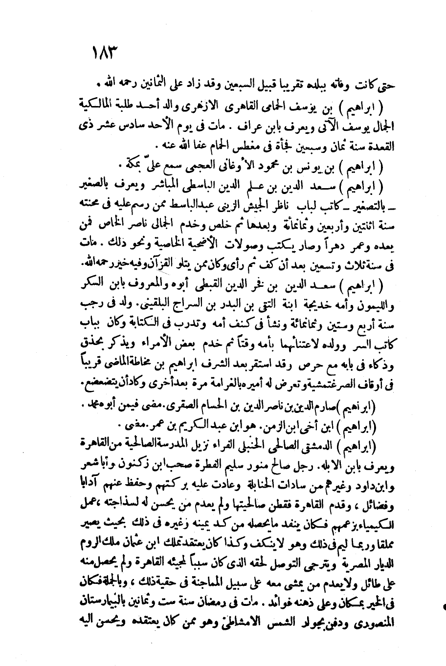 إِبْرَاهِيم الدِّمَشْقِي الصَّالِحِي الْحَنْبَلِيّ الْفراء نزيل الْمدرسَة الصالحية من الْقَاهِرَة وَيعرف بِابْن الأبله رجل صَالح منور سليم الْفطْرَة صحب ابْن زكنون وَأَبا شعر وَابْن دَاوُد وَغَيرهم من سَادَات الْحَنَابِلَة وعادت عَلَيْهِ بركتهم وَحفظ عَنْهُم آدابا وفضائل وَقدم الْقَاهِرَة فقطن صالحيتها وَلم يعْدم من يحسن لَهُ لسذاجته عمل الكيمياء بزعمهم فَكَانَ ينْفد مَا يحصله من كد يَمِينه)