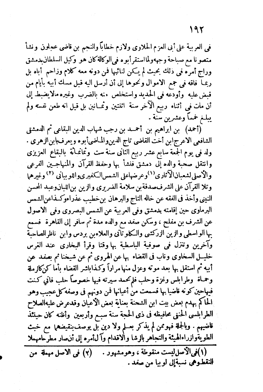 أَحْمد بن إِبْرَاهِيم بن أَحْمد بن رَجَب شهَاب الدّين البقاعي ثمَّ الدِّمَشْقِي الشَّافِعِي الْأَعْرَج ابْن أُخْت القَاضِي تَاج الدّين والماضي أَبوهُ وَيعرف بِابْن الزُّهْرِيّ. ولد فِي يَوْم الْجُمُعَة سَابِع عشر ربيع الثَّانِي سنة سِتّ وَثَمَانمِائَة بالبقاع العزيزي وانتقل صُحْبَة وَالِده إِلَى دمشق فَنَشَأَ بهَا وَحفظ الْقُرْآن والمنهاجين الفرعي والأصلي لشعبان الآثاري وعرضها على الشَّمْس الكفيري واللوبياني وَغَيرهمَا وتلا الْقُرْآن على الشّرف صَدَقَة بن سَلامَة الضريري والزين بن اللبان وَعبد المحسن النيني وَأخذ فِي الْفِقْه عَن خَاله التَّاج والبرهان بن خطيب عذراء وَكَذَا عَن الشَّمْس الْبرمَاوِيّ حِين إِقَامَته بِدِمَشْق وَفِي الْعَرَبيَّة عَن الشَّمْس البصروي وَفِي الْأُصُول عَن الشّرف بن مُفْلِح وَسكن صفد مَعَ وَالِده مُدَّة ثمَّ سَافر إِلَى الْقَاهِرَة فَسمع بهَا الوَاسِطِيّ والزين الزَّرْكَشِيّ والكلوتاتي والْعَلَاء بن بردس وَابْن نَاظر الصاحبة وَآخَرين وتنزل فِي صوفية الباسطية بهَا وقتا وَقَرَأَ البُخَارِيّ عِنْد الْغَرْس خَلِيل السخاوي وناب فِي الْقَضَاء بهَا عَن الْهَرَوِيّ ثمَّ عَن