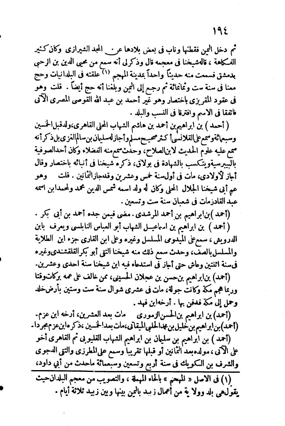 أَحْمد بن إِبْرَاهِيم بن أَحْمد بن هَاشم الشهَاب الْمحلي القاهري ولد قبل الْخمسين وَسَبْعمائة وَسمع على القلانسي أَكثر صَحِيح مُسلم وَأَجَازَ لَهُ سُلَيْمَان بن سَالم الْغَزِّي بل ذكر أَنه سمع عَلَيْهِ عُلُوم الحَدِيث لِابْنِ الصّلاح وَحدث سمع مِنْهُ الْفُضَلَاء وَكَانَ أحد الصُّوفِيَّة بالبيبرسية ويتكسب بِالشَّهَادَةِ فِي بولاق ذكره شَيخنَا فِي أنبائه بِاخْتِصَار وَقَالَ أجَاز لأولادي مَاتَ فِي أول سنة خمس وَعشْرين وَقد جَازَ الثَّمَانِينَ. قلت وَهُوَ عَم أبي شَيخنَا الْجلَال الْمحلي وَكَانَ لَهُ ولد اسْمه شمس الدّين مُحَمَّد ولمحمد ابْن اسْمه عبد الْقَادِر مَاتَ فِي شعْبَان سنة سِتّ وَتِسْعين.