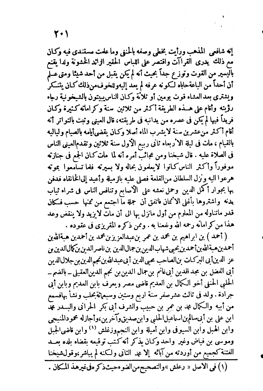 إِنَّه شَافِعِيّ الْمَذْهَب وَرَأَيْت بخطى وَصفه بالحنفي وَمَا علمت مستندي فِيهِ وَكَانَ مَعَ ذَلِك يدْرِي الْقرَاءَات وَاقْتصر على اللبَاس الحقير الزَّائِد الخشونة وَلذَا يقنع باليسير من الْقُوت وتوزع جدا بِحَيْثُ أَنه لم يكن يقبل من أحد شَيْئا وَمَتى علم أَن أحدا من الباعة حاباه لكَونه عرفه لم يعد إِلَيْهِ وللخوف من ذَلِك كَانَ يتنكر وَيَشْتَرِي بعد الْعشَاء قوت يَوْمَيْنِ أَو ثَلَاثَة وَكَانَ النَّاس يبيتُونَ بالشيخونية رَجَاء رُؤْيَته وَأقَام على هَذِه الطَّرِيقَة أَكثر من ثَلَاثِينَ سنة وكراماته كَثِيرَة وَكَانَ فريدا فِيهَا لم يكن فِي عصره من يدانيه فِي طَرِيقَته قَالَ الْعَيْنِيّ وَثَبت بالتواتر أَنه أَقَامَ أَكثر من عشْرين سنة لَا يشرب المَاء أصلا وَكَانَ يقْضِي أَيَّامه بالصيام ولياليه بِالْقيامِ مَاتَ فِي لَيْلَة الْأَرْبَعَاء ثَانِي ربيع الأول سنة ثَلَاثِينَ وَتقدم الْعَيْنِيّ النَّاس فِي الصَّلَاة عَلَيْهِ. قَالَ شَيخنَا وَمن عجائب أمره أَنه لما مَاتَ كَانَ الْجمع فِي جنَازَته موفورا وَأكْثر النَّاس كَانُوا لَا يعلمُونَ بِحَالهِ وَلَا بسيرته فَلَمَّا تسامعوا بِمَوْتِهِ هرعوا إِلَيْهِ وَنزل السُّلْطَان من القلعة فصلى عَلَيْهِ بالرميلة وأعيد إِلَى الخانقاه فَدفن بهَا بجوار أكمل الدّين وَحمل نعشه على الْأَصَابِع وتنافس النَّاس فِي شِرَاء ثِيَاب بدنه واشتروها بأغلى الْأَثْمَان فاتفق أَن جملَة مَا اجْتمع من ثمنهَا حسب فَكَانَ قدر مَا تنَاوله من الْمَعْلُوم من أول مَا نزل بهَا إِلَى أَن مَاتَ لَا يزِيد وَلَا ينْقض وعد هَذَا من كراماته رَحمَه الله ونفعنا بِهِ. وَمِمَّنْ ذكره المقريزي فِي عقوده.