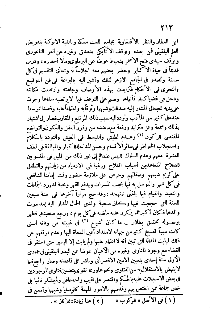 بن الْعَطَّار وَالنَّظَر بالأقبغاوية بِجَامِع السِّت مسكة وبالقبة الأنوكية بتفويض الْعلم البُلْقِينِيّ فَمن بعده وبوقف الأتابكي بِدِمَشْق وَغَيره عَن الْعِزّ الناعوري وبوقف سَيِّدي فتح الأسمر بدمياط عوضا عَن الْبرمَاوِيّ ومالا أحصره، ودرس قَدِيما فِي حَيَاة الأكابر وَحضر بَعضهم مَعَه أجلاسا لَهُ وتعاني التَّقْسِيم فِي كل سنة وتصدر فِي الْجَامِع الْأَزْهَر لذَلِك وأشير إِلَيْهِ بالبراعة فِي فن التوقيع والتحري فِي الْحُكَّام فتزايدت بِهَذِهِ الْأَوْصَاف وجاهته وَارْتَفَعت مكانته وَدخل فِي قضايا كبار فأنهاها وصمم على التَّوَقُّف فِيمَا لَا يرتضيه سفاها وَجَرت على يَدَيْهِ للجمالي الْمشَار إِلَيْهِ صدقَات وَشبههَا وثوقا بِهِ واعتمادا عَلَيْهِ وَقصد التَّوَسُّط عِنْده فِي كثير من المآرب وَتردد إِلَيْهِ بِسَبَب ذَلِك الْمُرْتَفع والمقارب فَصَارَ إِلَى اشتهار بذلك وَسُمْعَة وَعز متزايد ورفعة مَعَ مَا عِنْده من وفور الْعقل والسكون والتواضع الْمُقْتَضِي للركون وَعدم الطيش والتبسط فِي الْعَيْش والتودد بالْكلَام واستجلاب الخواطر فِي سَائِر الْأَقْسَام وَحسن المداخلة للكبار وَالْمُبَالغَة فِي لطف الْعشْرَة مَعَهم وَعدم السلوك لليبس عِنْدهم إِلَى غير ذَلِك من الْميل فِي المنسوبين للصلاح المتعاهدين أَسبَاب الْفَلاح ورغبة فِي الازدياد من زيارتهم والتطفل على كريم شيمهم وصفاتهم وحرص على مُلَازمَة حُضُور وَقت إمامنا الشَّافِعِي فِي كل شهر والتوسل بِهِ فِيمَا يجلب المسرات وَيدْفَع الْقَهْر ومحبة لشهود الْجَمَاعَات والتعبد وَالْقِيَام فِيمَا بَلغنِي للتهجد، وَقد حج مرَارًا آخرهَا فِي سنة سبعين السّنة الَّتِي حججْت فِيهَا وَكَانَ صُحْبَة وليد الْجمال الْمشَار إِلَيْهِ بعد موت والدهما فَكَانَ أكبرهما يُكَرر عَلَيْهِ ماضيه فِي كل يَوْم، وَرجع صحبتهما فَظهر بوصوله تَحْقِيق بطلَان مَا كَانَ أشيع فِي غيبته من وَفَاته الَّتِي كَانَت سَببا لفسخ كثير من جهاته لامتداد أعين السعاة إِلَيْهَا وَعدم توقفهم عَن ذَلِك ليثبت الْمقَالة الَّتِي تبين انه لَا اعْتِمَاد عَلَيْهَا وَلم يلبث إِلَّا الْيَسِير حَتَّى اسْتَقر فِي الْقَضَاء مَعَ وجود الْمَنَاوِيّ وَغَيره من الْأَعْيَان عوضا عَن الْبَدْر البُلْقِينِيّ فِي جُمَادَى الأولى سنة أحدى بِتَعْيِين الْأمين الأقصرائي وباشر على قَاعِدَته وَصَارَ يُرَاجع فِيمَا لَا ينْهض بالاستقلال بِهِ من الْفَتَاوَى وَنَحْوهَا وَرُبمَا تقوى بتضمين فتاوية الْمَوْجُودين فِي بعض الأسجلات عَلَيْهِ بالحكم وَاقْتصر على نقيب وَاحِد عَاقل وَلم يبتكر نَائِبا بل)