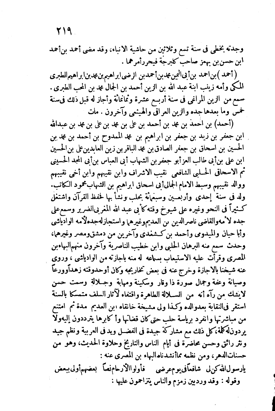 أَحْمد بن أَحْمد بن مُحَمَّد بن أَحْمد بن عَليّ بن مُحَمَّد بن عَليّ بن مُحَمَّد بن عبد الله بن جَعْفَر ابْن زيد بن جَعْفَر بن إِبْرَاهِيم بن مُحَمَّد الممدوح بن أَحْمد بن مُحَمَّد بن الْحُسَيْن بن إِسْحَاق بن جَعْفَر الصَّادِق بن مُحَمَّد الباقر بن زين العابدين عَليّ بن الْحُسَيْن بن عَليّ بن أبي طَالب الْعِزّ أَبُو جَعْفَر بن الشهَاب أبي الْعَبَّاس بن أبي الْمجد الْحُسَيْنِي ثمَّ الإسحاقي الْحلَبِي الشَّافِعِي نقيب الْأَشْرَاف وَابْن نقيبهم وَابْن أخي نقيبهم ووالد نقيبهم وسبط الإِمَام الجمالي أبي إِسْحَاق إِبْرَاهِيم بن الشهَاب مَحْمُود الْكَاتِب. / ولد فِي سنة إِحْدَى وَأَرْبَعين وَسَبْعمائة بحلب وَنَشَأ بهَا فحفظ الْقُرْآن واشتغل كثيرا فِي النَّحْو وَغَيره على شُيُوخ وقته كَأبي عبد الله المغربي الضَّرِير وَسمع على جده لأمه وَالْقَاضِي نَاصِر الدّين بن العديم وَغَيرهمَا واستجاز لَهُ جده لأمه الوادياشي وَأَبا حَيَّان والميدومي وَأحمد بن كشغدى وَآخَرين من دمشق ومصر وَغَيرهمَا، وَحدث سمع مِنْهُ الْبُرْهَان الْحلَبِي وَابْن خطيب الناصرية وَآخَرُونَ مِنْهُم الْبَهَاء بن الْمصْرِيّ وقرأت عَلَيْهِ الِاسْتِيعَاب بِسَمَاعِهِ لَهُ مِنْهُ بإجازته من الادياشي، وروى عَنهُ شَيخنَا بِالْإِجَازَةِ وَخرج عَنهُ فِي بعض تخاريجه وَكَانَ أوحد وقته زهدا وورعا وصيانة وعفة وجمال صُورَة ذَا وقار وسكينة ومهابة وجلالة وسمت حسن لَا يشك من رَآهُ أَنه من السلالة الطاهرة واقتفاء لآثار السّلف متمسكا بِالسنةِ اسْتَقر فِي النقابة بعدو وَالِده وَكَذَا ولي مشيخة خانقاه ابْن العديم مُدَّة ثمَّ امْتنع من مباشرتها وَانْفَرَدَ برياسة حلب حَتَّى كَانَ قضاتها وأكابرها يَتَرَدَّدُونَ إِلَيْهِ وَلَا يردون لَهُ كلمة، كل ذَلِك مَعَ مُشَاركَة جَيِّدَة فِي الْفضل وَيَد فِي الْعَرَبيَّة ونظم جيد ونثر رائق وَحسن محاضرة فِي أَيَّام النَّاس والتاريخ وحلاوة الحَدِيث، وَهُوَ من حَسَنَات الدَّهْر، وَمن نظمه مِمَّا أنشدناه الْبَهَاء بن الْمصْرِيّ عَنهُ: