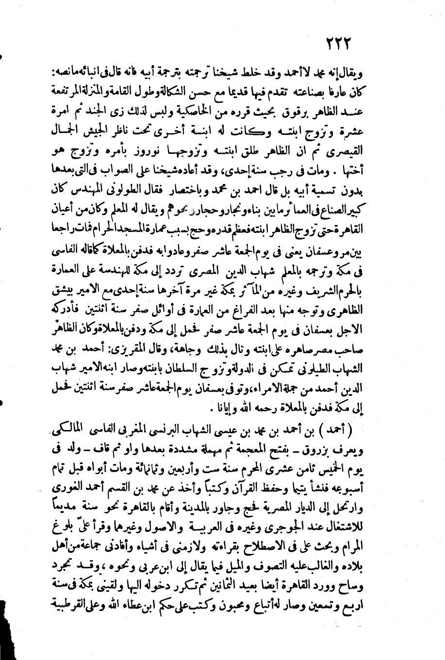 وَمَات فِي رَجَب سنة إِحْدَى، وَقد أَعَادَهُ شَيخنَا على الصَّوَاب فِي الَّتِي بعْدهَا بِدُونِ تَسْمِيَة أَبِيه بل قَالَ أَحْمد بن مُحَمَّد وباختصار فَقَالَ الطولوني المهندس كَانَ كَبِير الصناع فِي العمائر مَا بَين بِنَاء ونجار وحجار وَنَحْوهم وَيُقَال لَهُ الْمعلم وَكَانَ من أَعْيَان الْقَاهِرَة حَتَّى تزوج الظَّاهِر ابْنَته فَعظم قدره وَحج بِسَبَب عمَارَة الْمَسْجِد الْحَرَام فَمَاتَ رَاجعا بَين مرو عسفان يَعْنِي فِي يَوْم الْجُمُعَة عَاشر صفر وعادوا بِهِ فَدفن بالمعلاة كَمَا قَالَه الفاسي فِي مَكَّة وترجمه بالمعلم شهَاب الدّين الْمصْرِيّ تردد إِلَى مَكَّة للهندسة على الْعِمَارَة بِالْحرم الشريف وَغَيره من المآثر بِمَكَّة غير مرّة آخرهَا سنة إِحْدَى مَعَ الْأَمِير بيشق الظَّاهِرِيّ وَتوجه مِنْهَا بعد الفرغ من الْعِمَارَة فِي أَوَائِل صفر سنة اثْنَتَيْنِ فأدركه الْأَجَل بعسفان فِي يَوْم الْجُمُعَة عَاشر صفر فَحمل إِلَى مَكَّة وَدفن بالمعلاة وَكَانَ الظَّاهِر صَاحب مصر صاهره على ابْنَته ونال بذلك وجاهة، وَقَالَ المقريزي: أَحْمد بن مُحَمَّد الشهَاب الطيلوني تمكن فِي الدولة وَتزَوج السُّلْطَان بابنته وَصَارَ ابْنه الْأَمِير شهَاب الدّين أَحْمد من جملَة الْأُمَرَاء، وَتُوفِّي بعسفان يَوْم الْجُمُعَة عَاشر صفر سنة اثْنَتَيْنِ فَحمل إِلَى مَكَّة فَدفن بالمعلان رَحمَه الله وإيانا.