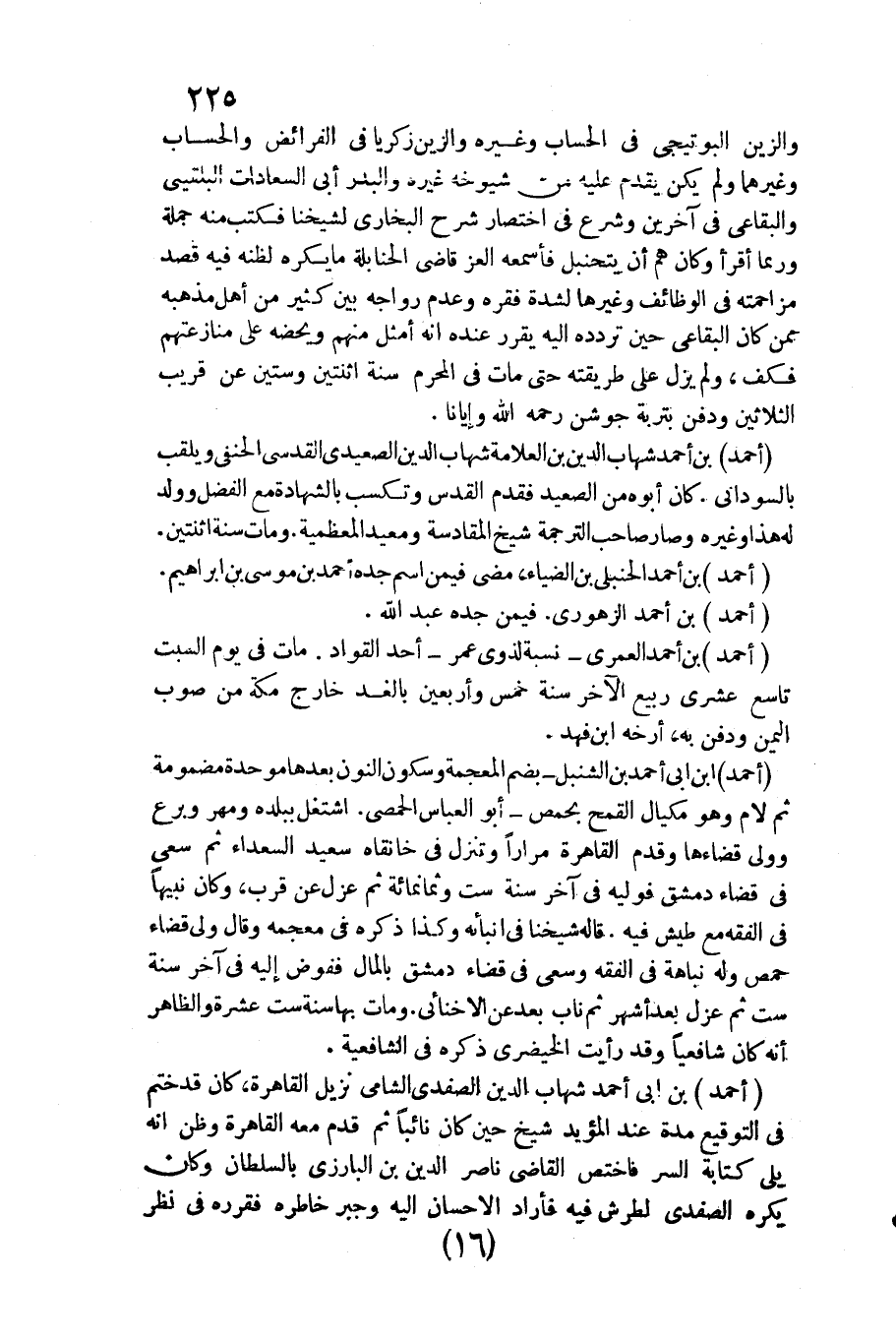 البوتيجي فِي الْحساب وَغَيره والزين زَكَرِيَّا فِي الْفَرَائِض والحساب وَغَيرهمَا وَلم يكن يقدم عَلَيْهِ من شُيُوخه غَيره والبدر أبي السعادات البُلْقِينِيّ والبقاعي فِي آخَرين وَشرع فِي اخْتِصَار شرح البُخَارِيّ لشَيْخِنَا فَكتب مِنْهُ جملَة وَرُبمَا أَقرَأ وَكَانَ هم أَن يتحنبل فأسمعه الْعِزّ قَاضِي الْحَنَابِلَة مَا يكره لظَنّه فِيهِ قصد مزاحمته فِي الْوَظَائِف وَغَيرهَا لشدَّة فقره وَعدم رواجه بَين كثير من أهل مذْهبه مِمَّن كَانَ البقاعي حِين تردده إِلَيْهِ يُقرر عِنْده أَنه أمثل مِنْهُم ويحضه على منازعتهم فَكف، وَلم يزل على طَرِيقَته حَتَّى مَاتَ فِي الْمحرم سنة اثْنَتَيْنِ وَسِتِّينَ عَن قريب الثَّلَاثِينَ وَدفن بتربة جوشن رَحمَه الله وإيانا.