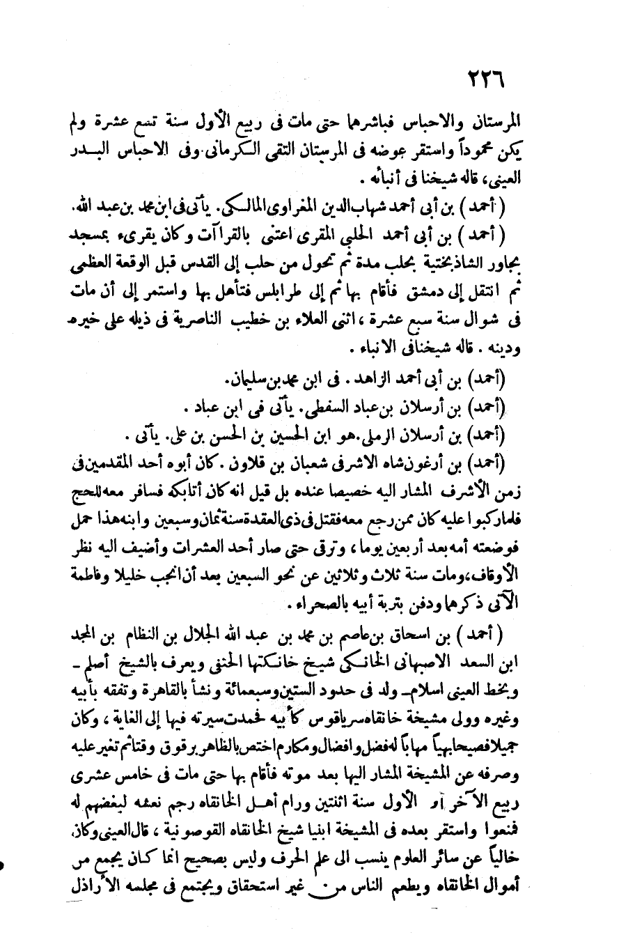 أحمدبن أرغون شاه الأشرفي شعْبَان بن قلاون. / كَانَ أَبوهُ أحد المقدمين فِي زمن الْأَشْرَف الْمشَار إِلَيْهِ خصيصا عِنْده بل قيل أَنه كَانَ أتابكه فسافر مَعَه لِلْحَجِّ فَلَمَّا ركبُوا عَلَيْهِ كَانَ مِمَّن رَجَعَ مَعَه فَقتل فِي ذِي الْعقْدَة سنة ثَمَان وَسبعين وَابْنه هَذَا حمل فَوَضَعته أمه بعد أَرْبَعِينَ يَوْمًا، وترقى حَتَّى صَار أحد الشعرات وأضيف إِلَيْهِ نظر الْأَوْقَاف، وَمَات سنة ثَلَاث وَثَلَاثِينَ عَن نَحْو السّبْعين بعد أَن أَنْجَب خَلِيلًا وَفَاطِمَة الْآتِي ذكرهمَا وَدفن بتربة أَبِيه بالصحراء.