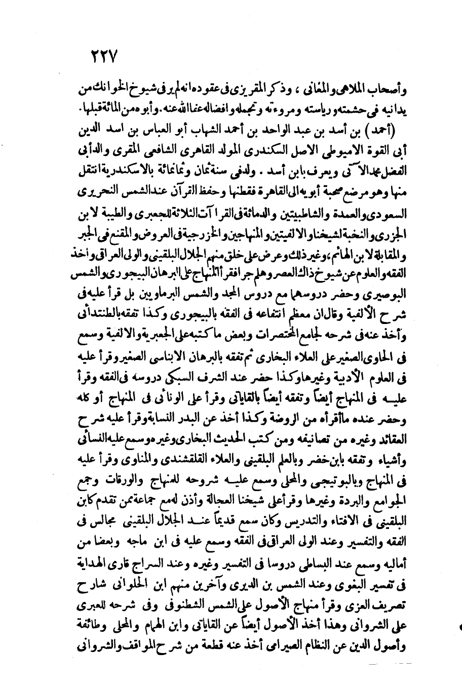 أَحْمد بن أَسد بن عبد الْوَاحِد بن أَحْمد الشهَاب أَبُو الْعَبَّاس بن أَسد الدّين أبي الْقُوَّة الأميوطي الأَصْل السكندري المولد القاهري الشَّافِعِي الْمُقْرِئ وَالِد أبي الْفضل مُحَمَّد الْآتِي وَيعرف بِابْن أَسد. / ولد فِي سنة ثَمَان وَثَمَانمِائَة بالاسكندرية انْتقل مِنْهَا وَهُوَ مرضع صُحْبَة أَبَوَيْهِ إِلَى الْقَاهِرَة فقطنها وَحفظ الْقُرْآن عِنْد الشَّمْس النحريري السعودي والعمدة والشاطبيتين والدماثة فِي الْقرَاءَات الثَّلَاثَة للجعبري والطيبة لِابْنِ الْجَزرِي والنخبة لشَيْخِنَا والألفيتين والمنهاجين والخزرجية فِي الْعرُوض وَالْمقنع فِي الْجَبْر والمقابلة لِابْنِ الهائم، وَغير ذَلِك وَعرض على خلق مِنْهُم الْجلَال البُلْقِينِيّ وَالْوَلِيّ الْعِرَاقِيّ وَأخذ الْفِقْه والعلوم عَن شُيُوخ ذَاك الْعَصْر وهلم جرا فَقَرَأَ الْمِنْهَاج على الْبُرْهَان البيجوري وَالشَّمْس البوصيري وَحضر دروسهما مَعَ دروس الْمجد وَالشَّمْس البرماويين بل قَرَأَ عَلَيْهِ فِي شرح الألفية وَقَالَ أَن مُعظم انتفاعه فِي الْفِقْه بالبيجوري وَكَذَا تفقه بالطنتدائي وَأخذ عَنهُ فِي شَرحه لجامع المختصرات وَبَعض مَا كتبه على الجعبرية والألفية وَسمع فِي الْحَاوِي الصَّغِير على الْعَلَاء البُخَارِيّ ثمَّ تفقه بالبرهان الأبناسي الصَّغِير وَقَرَأَ عَلَيْهِ فِي الْعُلُوم الأدبية وَغَيرهَا وَكَذَا حضر عِنْد الشّرف السُّبْكِيّ دروسه فِي الْفِقْه وَقَرَأَ عَلَيْهِ فِي الْمِنْهَاج أَيْضا وتفقه أَيْضا بالقاياتي وَقَرَأَ على الونائي فِي الْمِنْهَاج أَو كُله وَحضر عِنْده مَا أقرأه من الرَّوْضَة وَكَذَا أَخذ عَن الْبَدْر النسابة وقرا عَلَيْهِ شرح العقائد وَغَيره من تصانيفه وَمن كتب الحَدِيث البُخَارِيّ وَغَيره وَسمع عَلَيْهِ النَّسَائِيّ وَأَشْيَاء وتفقه بِابْن خضر وبالعلم البُلْقِينِيّ والْعَلَاء القلقشندي والمناوي وَقَرَأَ عَلَيْهِ فِي الْمِنْهَاج وبالبوتيجي والمحلي وَسمع عَلَيْهِ شروحه للمنهاج والورقات وَجمع الْجَوَامِع والبردة وَغَيرهَا وَقَرَأَ على شَيخنَا العجالة وَأذن لَهُ مَعَ جمَاعَة مِمَّن تقدم كَابْن البُلْقِينِيّ فِي الْإِفْتَاء والتدريس وَكَانَ سمع قَدِيما عِنْد الْجلَال البُلْقِينِيّ مجَالِس فِي الْفِقْه وَالتَّفْسِير وَعند الْوَلِيّ الْعِرَاقِيّ فِي الْفِقْه وَسمع عَلَيْهِ فِي ابْن مَاجَه وبعضا من أَمَالِيهِ وَسمع عِنْد الْبِسَاطِيّ دروسا فِي التَّفْسِير وَغَيره وَعند السراج قَارِئ الْهِدَايَة فِي تَفْسِير الْبَغَوِيّ وَعند الشَّمْس بن الديري وَآخَرين مِنْهُم ابْن الْحلْوانِي شَارِح تصريف الْعُزَّى وَقَرَأَ منهاج الْأُصُول على الشَّمْس الشطنوفي وَفِي شَرحه للعبري على الشرواني وَهَذَا أَخذ الْأُصُول أَيْضا عَن القاياتي وَابْن الْهمام والمحلى وَطَائِفَة وأصول الدّين عَن النظام الصيرامي أَخذ عَنهُ قِطْعَة من شرح المواقف والشرواني