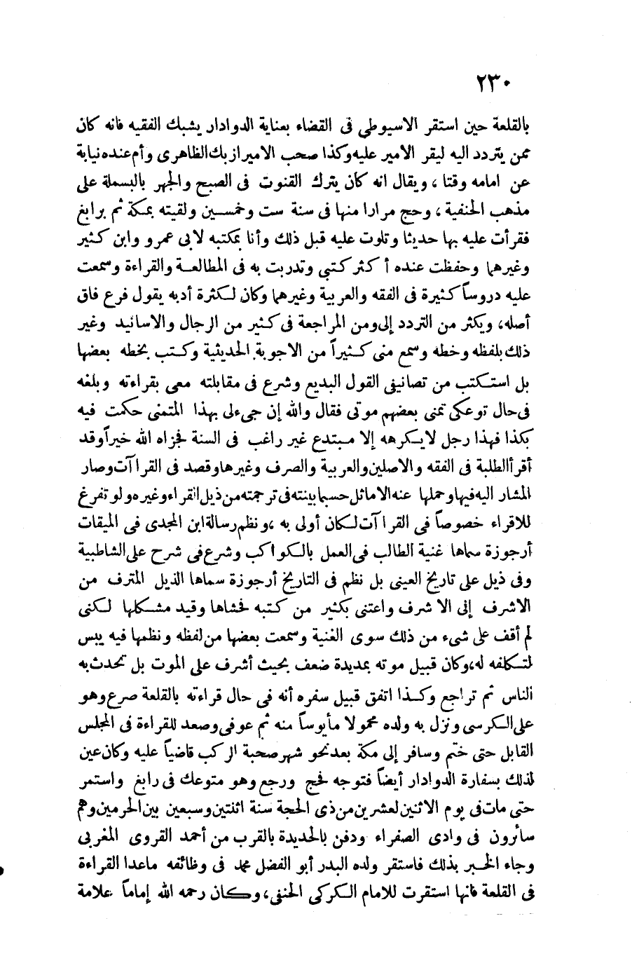 الرِّجَال والأسانيد وَغير ذَلِك بِلَفْظِهِ وخطه وَسمع مني كثيرا من الْأَجْوِبَة الحديثية وَكتب بِخَطِّهِ بَعْضهَا بل استكتب من تصانيفي القَوْل البديع وَشرع فِي مُقَابلَته معي بقرَاءَته وبلغه فِي حَال توعكي تمني بَعضهم موتى فَقَالَ وَالله إِن جِيءَ لي بِهَذَا المتمني حكمت فِيهِ بِكَذَا فَهَذَا رجل لَا يكرههُ إِلَّا مُبْتَدع غير رَاغِب فِي السّنة فجزاه الله خيرا وَقد أَقرَأ الطّلبَة فِي الْفِقْه والأصلين والعربية وَالصرْف وَغَيرهَا وَقصد فِي الْقرَاءَات وَصَارَ الْمشَار إِلَيْهِ فِيهَا وَحملهَا عَنهُ إِلَّا ماثل حَسْبَمَا بَينته فِي تَرْجَمته من ذيل الْقُرَّاء وَغَيره وَلَو تفرغ للإقراء خُصُوصا فِي الْقرَاءَات لَكَانَ أولى بِهِ، ونظم رِسَالَة ابْن المجدي فِي الْمِيقَات أرجوزة سَمَّاهَا غنية الطَّالِب فِي الْعَمَل بالكواكب وَشرع فِي شرح على الشاطبية وَفِي ذيل على تَارِيخ الْعَيْنِيّ بل نظم فِي التَّارِيخ أرجوزة سَمَّاهَا الذيل غنية الطَّالِب فِي الْعَمَل بالكواكب وَشرع فِي شرح على الشاطبية وَفِي ذيل على تَارِيخ الْعَيْنِيّ بل نظم فِي التَّارِيخ أرجوزة سَمَّاهَا الذيل المترف من الْأَشْرَف إِلَى الْأَشْرَف واعتنى بِكَثِير من كتبه فحشاها وَقيد مشكلها لكني لم أَقف على شَيْء من ذَلِك سوى الغنية وَسمعت بَعْضهَا من لَفظه ونظمها فِيهِ يبس لتكلفه لَهُ، وَكَانَ قبيل مَوته، عديدة ضعف بِحَيْثُ أشرف على الْمَوْت بل تحدث بِهِ النَّاس ثمَّ تراجع وَكَذَا اتّفق قبيل سَفَره أَنه فِي حَال قِرَاءَته بالقلعة صرع وَهُوَ على الْكُرْسِيّ وَنزل بِهِ وَلَده مَحْمُولا مايوسا نمه ثمَّ عوفي وَصعد للْقِرَاءَة فِي الْمجْلس الْقَابِل حَتَّى ختم وسافر إِلَى مَكَّة بعد نَحْو شهر صُحْبَة الركب قَاضِيا عَلَيْهِ وَكَانَ عين لذَلِك بسفارة الدوادار أَيْضا فَتوجه فحج وَرجع وَهُوَ متوعك فِي رابغ وَاسْتمرّ حَتَّى مَاتَ فِي يَوْم الِاثْنَيْنِ لعشرين من ذِي الْحجَّة سنة اثْنَتَيْنِ وَسبعين بَين الْحَرَمَيْنِ وهم سائرون فِي وَادي الصَّفْرَاء وَدفن بالحديدة بِالْقربِ من أَحْمد الْقَرَوِي المغربي وَجَاء بالْخبر بذلك فاستقر وَلَده الْبَدْر أَبُو الْفضل مُحَمَّد فِي وظائفه مَا عدا الْقِرَاءَة فِي القلعة فَإِنَّهَا اسْتَقَرَّتْ للْإِمَام الكركي الْحَنَفِيّ، وَكَانَ رَحمَه الله إِمَامًا عَلامَة