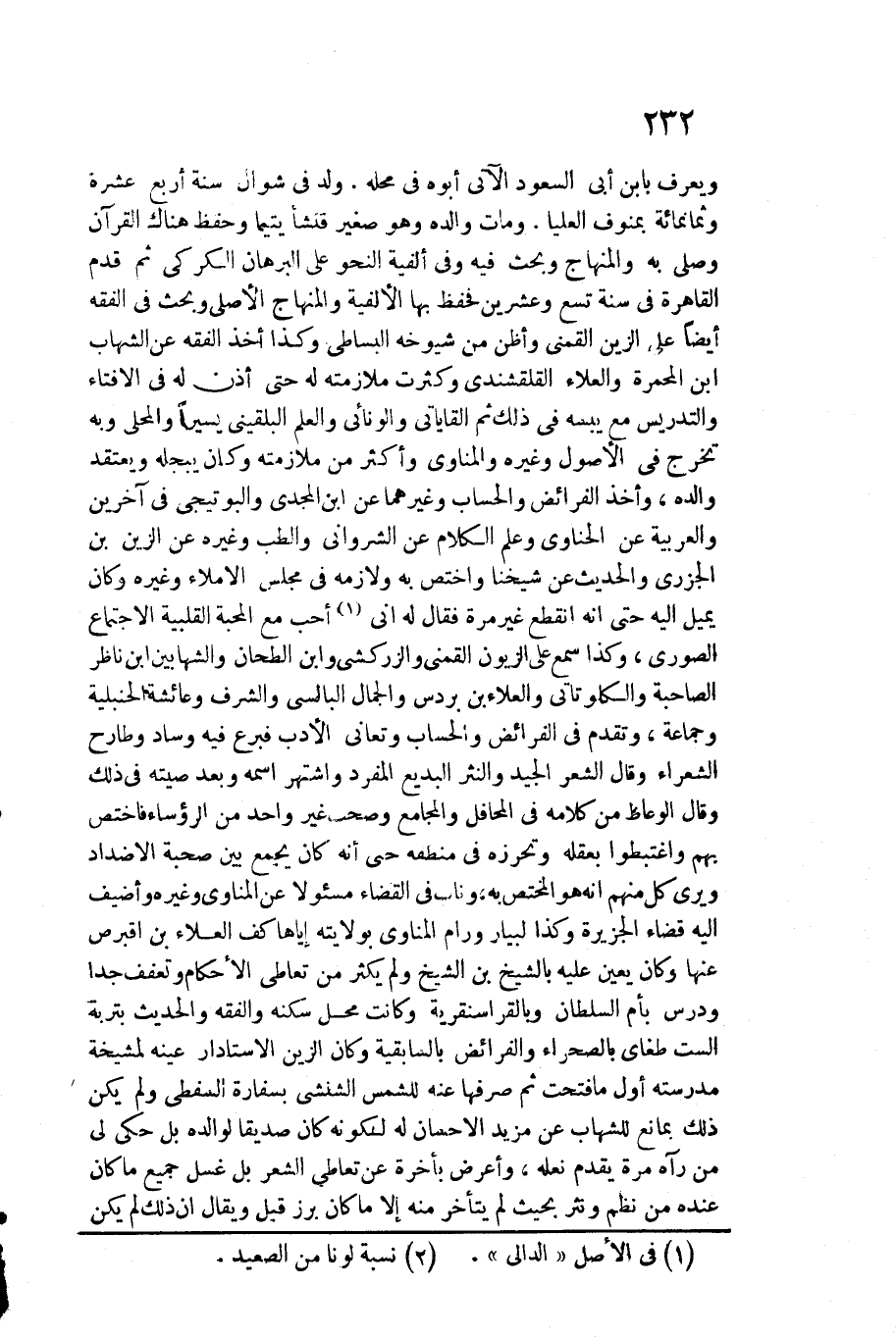 وَيعرف بِابْن أبي السُّعُود الْآتِي أَبوهُ فِي مَحَله. / ولد فِي شَوَّال سنة أَربع عشرَة وَثَمَانمِائَة بمنوف الْعليا. وَمَات وَالِده وَهُوَ صَغِير فتشأ يَتِيما وَحفظ هُنَاكَ الْقُرْآن وَصلى بِهِ والمنهاج وَبحث فِيهِ وَفِي ألفية النَّحْو على الْبُرْهَان الكركي ثمَّ قدم الْقَاهِرَة فِي سنة تسع وَعشْرين فحفظ بهَا الألفية والمنهاج الْأَصْلِيّ وَبحث فِي الْفِقْه أَيْضا على الزين القمني وأظن من شُيُوخه الْبِسَاطِيّ وَكَذَا أَخذ الْفِقْه عَن الشهَاب بن المحمرة والْعَلَاء القلقشندي وَكَثُرت ملامته لَهُ حَتَّى أذن لَهُ فِي الْإِفْتَاء والتدريس مَعَ يبسه فِي ذَلِك ثمَّ القاياتي والونائي وَالْعلم البُلْقِينِيّ يَسِيرا والمحلى وَبِه تخرج فِي الْأُصُول وَغَيره)
