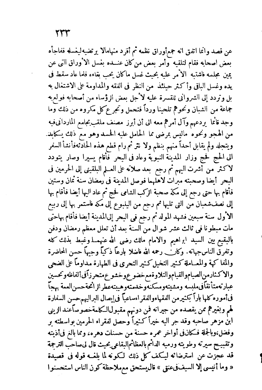 فَأَنْشَأَ السّفر إِلَى الْحَج فحج وزار الْمَدِينَة النَّبَوِيَّة وَعَاد فِي الْبَحْر فَأَقَامَ يَسِيرا وَصَارَ يتودد لأكْثر من أَشرت إِلَيْهِم ثمَّ رَجَعَ بعد صلَاته على الْعلم البُلْقِينِيّ إِلَى الْحَرَمَيْنِ فِي الْبَحْر أَيْضا وصحبته ميبرات لأهلهما فوصل الْمَدِينَة فِي رَمَضَان سنة ثَمَان وَسِتِّينَ فَأَقَامَ بهَا حَتَّى رَجَعَ إِلَى مَكَّة صحب الركب الشَّامي فحج ثمَّ عَاد إِلَيْهَا أَيْضا فَأَقَامَ بهَا إِلَى نصف شعْبَان من الَّتِي تَلِيهَا ثمَّ رَجَعَ من الينبوع إِلَى مَكَّة فاستمر بهَا إِلَى ربيع الأول لسنة سبعين فَشهد المولد ثمَّ رَجَعَ فِي الْبَحْر إِلَى الْمَدِينَة أَيْضا فَأَقَامَ بهَا حَتَّى مَاتَ مبطونا فِي ثَالِث عشر شَوَّال من السّنة بعد أَن تعلل مُعظم رَمَضَان وَدفن بِالبَقِيعِ بَين السَّيِّد إِبْرَاهِيم وَالْإِمَام مَالك رَضِي الله عَنْهُمَا وغبط بذلك كُله وتفرق النَّاس جهاته. وَكَانَ رَحمَه الله فَاضلا بارعا ذكيا وجيها حسن المحاضرة والمفاكهة والمعاملة كثير التخيل كثير التَّحَرِّي فِي الطَّهَارَة مداوما على الضُّحَى والإكثار من الصّيام وَالْقِيَام والتلاوة مَعَ خضوع وخشوع متحرزا فِي أَلْفَاظه وتحسين عِبَارَته متأنقا فِي ملبسه ومشيته ومسكنه وخدمته وهيبته عطر الرَّائِحَة حسن الْعمة بهجة فِي أُمُوره كلهَا بارا بِكَثِير من الْفُقَهَاء والفقراء ساعيا فِي إِيصَال الْبر إِلَيْهِم حسن السفارة لَهُم وبغيرهم مِمَّن يَقْصِدهُ من جِيرَانه فَمن دونهم مَقْبُول الْكَلِمَة خُصُوصا عِنْد الزيني بن مزهر صَاحبه وَقد جر إِلَيْهِ خيرا كثيرا وَحصل لفقراء الْحَرَمَيْنِ بواسطته بر وَفضل، وَبِالْجُمْلَةِ فَكَانَ فِي أَوَاخِر عمره حَسَنَة من حَسَنَات دهره، وَمِمَّا بَالغ فِي أذيته وتقبيح سيرته وطويته ورميه الدَّائِم بالعظائم البقاعي بِحَيْثُ قَالَ لي صَاحب التَّرْجَمَة قد عجزت عَن استرضائه ليكف كل ذَلِك لكَونه لما بلغه قَوْله فِي قصيدة وَمَا أنيسي إِلَّا السَّيْف فِي عنقِي قَالَ يسْتَحق مَعَ مُلَاحظَة كَون النَّاس استحسنوا