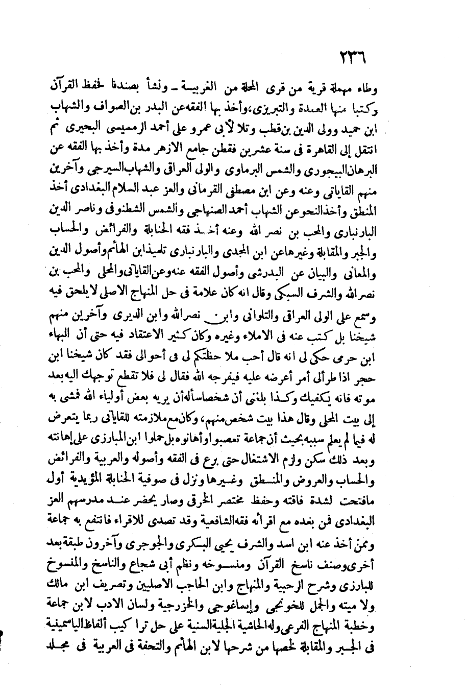 الهائم وأصول الدّين والمعاني وَالْبَيَان عَن البدرشي وأصول الْفِقْه عَنهُ وَعَن القاياتي والمحلى والمحب بن نصر الله والشرف السُّبْكِيّ وَقَالَ أَنه كَانَ عَلامَة فِي حل الْمِنْهَاج الْأَصْلِيّ لَا يلْحق فِيهِ وَسمع على الْوَلِيّ الْعِرَاقِيّ والتلواني وَابْن نصر الله وَابْن الديري وَآخَرين مِنْهُم شَيخنَا بل كتب عَنهُ فِي الْإِمْلَاء وَغَيره وَكَانَ كثير الِاعْتِقَاد فِيهِ حَتَّى أَن الْبَهَاء بن حرمي حكى لي أَنه قَالَ أحب ملاحظتكم لي فَلَا تقطع توجهك إِلَيْهِ بعد مَوته فَإِنَّهُ يَكْفِيك وَكَذَا بَلغنِي أَن شخصا سَأَلَهُ أَن يرِيه بعض أَوْلِيَاء الله فَمشى بِهِ إِلَى بَيت الْمحلى وَقَالَ هَذَا بَيت شخص مِنْهُم، وَكَانَ مَعَ ملازمته للقاياتي رُبمَا يتَعَرَّض لَهُ فِيمَا لم يعلم سَببه بِحَيْثُ أَن جمَاعَة تعصبوا وأهانوه بل حموا ابْن المبارزي على إهانته وَبعد ذَلِك سكن وَلزِمَ الِاشْتِغَال حَتَّى برع فِي الْفِقْه وأصوله والعربية والفرائض والحساب وَالْعرُوض والمنطق وَغَيرهَا وَنزل فِي صوفية الْحَنَابِلَة المؤيدية أول مَا فتحت لشدَّة فاقته وَحفظ مُخْتَصر الْخرقِيّ وَصَارَ يحضر عِنْد مدرسهم الْعِزّ الْبَغْدَادِيّ فَمن بعده مَعَ أقرائه فقه الشَّافِعِيَّة وَقد تصدى للإقراء فَانْتَفع بِهِ جمَاعَة وَمِمَّنْ أَخذ عَنهُ ابْن أَسد والشرف يحيى الْبكْرِيّ والجوجري وَآخَرُونَ طبقَة بعد أُخْرَى وصنف نَاسخ الْقُرْآن ومنسوخه ونظم أبي شُجَاع والناسخ والمنسوخ للبارزي وَشرح الرحبية والمنهاج وَابْن الْحَاجِب الأصليين وتصريف ابْن مَالك وَلَا ميته والجمل للخونجي وإيساغوجي والخزرجية ولسان الْأَدَب لِابْنِ جمَاعَة وخطبة الْمِنْهَاج الفرعي وَله الْحَاشِيَة الجلية السّنيَّة على حل تراكيب أَلْفَاظ الياسمينية فِي الْجَبْر والمقابلة لخصها من شرحها لِابْنِ الهائم والتحفة فِي الْعَرَبيَّة فِي مُجَلد