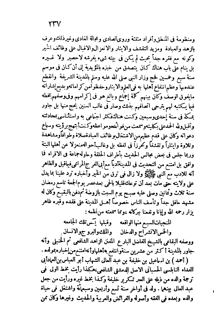ومنظومة فِي الْمنطق وأفراد مُثَلّثَة وروى الصادي وعجالة الغادي وَغير ذَلِك وَعرف بالزهد وَالْعِبَادَة ومزيد التقشف والإيثار والانعزال والإقبال على وظائف الْخَيْر وَكَونه مَعَ فقره جدا بِحَيْثُ لم يكن فِي بَيته شئ يفرشه لَا حَصِير وَلَا غَيره بل ينَام على بَاب هُنَاكَ كَانَ يتَصَدَّق من خبزه بالمؤيدية إِلَى أَن كَانَ فِي موسم سنة سبع وَخمسين فحج وزارة النَّبِي صلى الله عَلَيْهِ وَسلم بِالْمَدِينَةِ الشَّرِيفَة وَانْقطع عِنْده بهَا وَعظم انْتِفَاع أَهلهَا بِهِ فِي الْعلم والإيثار وحفظوا من كراماته وبديع إشاراته مَا يفوق الْوَصْف وَكَانَ بَينهم كلمة إِجْمَاع وَبَالغ هُوَ فِي إكرامهم وَفِي وَصفهم بِخَطِّهِ فِيمَا يَكْتُبهُ لَهُم يترجى اتصافهم بذلك وَصَارَ فِي غَالب السنين يحجّ مِنْهَا بل جاور بِمَكَّة فِي سنة إِحْدَى وَسبعين وَكنت هُنَاكَ فَكثر اجتماعي بِهِ واستئناسي بمحادثته وَأَقْبل وَللَّه الْحَمد عَليّ بكليته وَسمعت من فَوَائده ومواعظه وَكنت أبتهج بِرُؤْيَتِهِ وَسَمَاع دعواته وَكَانَ على قدم عَظِيم من)