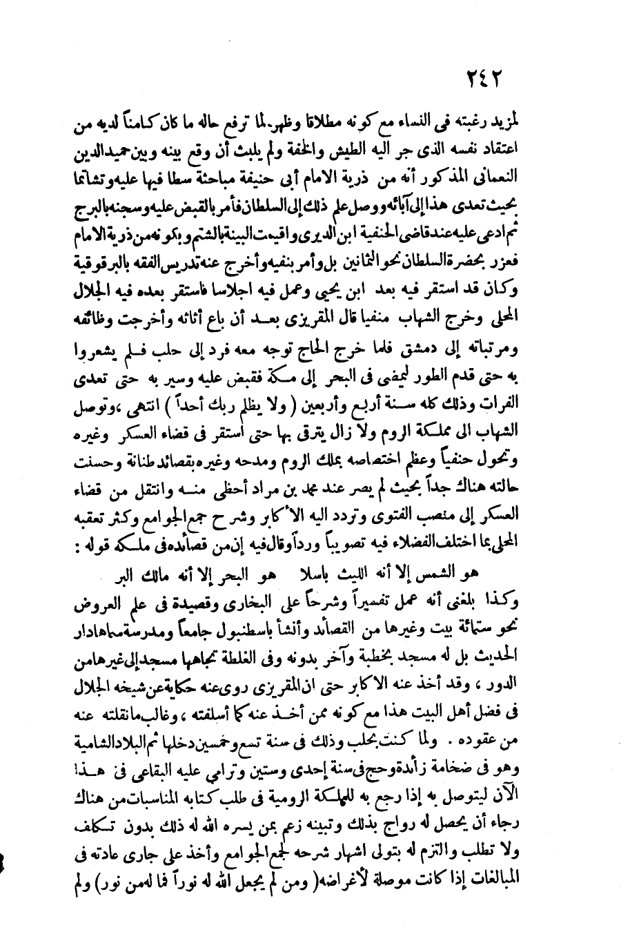 لمزيد رغبته فِي النِّسَاء مَعَ كَونه مطلاقا وَظهر لما ترفع حَاله مَا كَانَ كامنا لَدَيْهِ من اعْتِقَاد نَفسه الَّذِي جر إِلَيْهِ الطيش والخفة وَلم يلبث أَن وَقع بَينه وَبَين حميد الدّين النعماني الْمَذْكُور أَنه من ذُرِّيَّة الإِمَام أبي حنيفَة مباحثة سَطَا فِيهَا عَلَيْهِ وتشاتما بِحَيْثُ تعدى هَذَا إِلَى آبَائِهِ وَوصل علم ذَلِك إِلَى السُّلْطَان فَأمر بِالْقَبْضِ عَلَيْهِ وسجنه بالبرج ثمَّ ادّعى عَلَيْهِ عِنْد قَاضِي الْحَنَفِيَّة ابْن الديري وأقيمت الْبَيِّنَة بالشتم وبكونه من ذُرِّيَّة الإِمَام فعزز بِحَضْرَة السُّلْطَان نَحْو الثَّمَانِينَ بل وَأمر بنفيه وَأخرج عَنهُ تدريس الْفِقْه بالبرقوقية وَكَانَ قد اسْتَقر فِيهِ بعد ابْن يحيى وَعمل فِيهِ أجلاسا فاستقر بعده فِيهِ الْجلَال الْمحلى وَخرج الشهَاب منفيا قَالَ المقريزي بعد أَن بَاعَ أثاثه وأخرجت وظائفه ومرتباته إِلَى دمشق فَلَمَّا خرج الْحَاج توجه مَعَه فَرد إِلَى حلب فَلم يشعروا بِهِ حَتَّى قدم الطّور ليمضي فِي الْبَحْر إِلَى مَكَّة فَقبض عَلَيْهِ وسير بِهِ حَتَّى تعدى الْفُرَات وَذَلِكَ كُله سنة أَربع وَأَرْبَعين وَلَا يظلم رَبك أحدا انْتهى، وتوصل الشهَاب إِلَى مملكة الرّوم وَلَا زَالَ يترقى بهَا حَتَّى اسْتَقر فِي قَضَاء الْعَسْكَر وَغَيره وتحول حنفيا وَعظم اخْتِصَاصه بِملك الرّوم ومدحه وَغَيره بقصائد طنانة وَحسنت حَالَته)