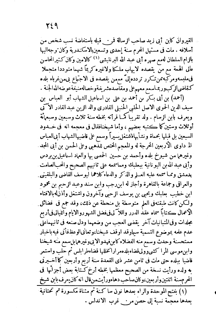 وَيحيى بن يُوسُف الرَّحبِي وَآخَرُونَ واشتغل واذن لَهُ بالإفتاء وَلَكِن كَانَت طبقته فِي الْعلم متوسطة بل منحطة عَن ذَلِك، وَقد جمع فِي فَضَائِل الْأَعْمَال كتابا سَمَّاهُ عقد الدُّرَر واللآلي فِي فضل الشُّهُور وَالْأَيَّام والليالي فِي أَربع مجلدات وَفِي المتبانيات آخر يقْضِي الْعجب من وضعهما وَدلّ صنعه فِي ثَانِيهمَا على عدم علمه بموضوع التَّسْمِيَة سِيمَا وَقد أوقف شَيخنَا، وتعانى الْوَعْظ فاتى فِيهِ بأخبار مستحسنة وَحدث وَسمع مِنْهُ الْفُضَلَاء كَابْن فَهد والأبي وَغَيرهمَا بل سمع مِنْهُ شَيخنَا وَابْن مُوسَى المراكشي وَولي قَضَاء بَلَده مرَارًا تخللها قَضَاء طرابلس ثمَّ حلب وَاسْتمرّ قَاضِيا بِبَلَدِهِ حَتَّى مَاتَ فِي ثامن عشر ذِي الْقعدَة سنة أَربع وَأَرْبَعين كَمَا أَخْبرنِي بِهِ وَلَده وَرَأَيْت نُسْخَة من الصَّحِيح معظمها بِخَطِّهِ أرخ كِتَابَة بعض أَجْزَائِهَا فِي الْمحرم سنة اثْنَتَيْنِ وَأَرْبَعين، وَكَانَ صَاحب دهاء وَرَأَيْت من قَالَ أَنه كَانَ يعرف بِابْن شيخ