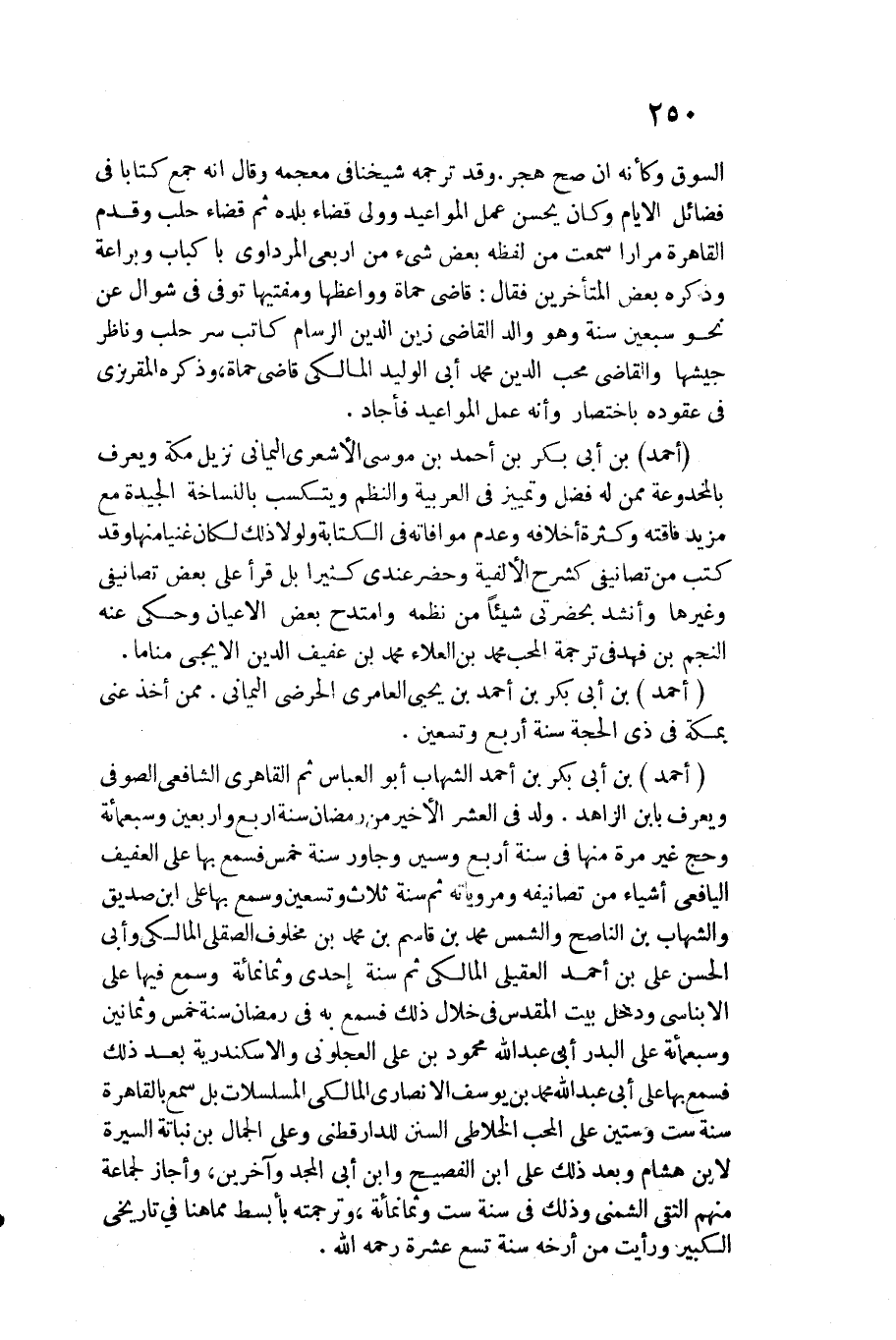 السُّوق وَكَأَنَّهُ إِن صَحَّ هجر. وَقد تَرْجمهُ شَيخنَا فِي مُعْجَمه وَقَالَ أَنه جمع كتابا فِي فَضَائِل الْأَيَّام وَكَانَ يحسن عمل المواعيد وَولي قَضَاء بَلَده ثمَّ قَضَاء حلب وَقدم الْقَاهِرَة مرَارًا سَمِعت من لَفظه بعض شَيْء من أربعي المرداوي باكباب وبراعة وَذكره بعض الْمُتَأَخِّرين فَقَالَ: ققاضي حماة وواعظها ومفتيها توفّي فِي شَوَّال عَن نَحْو سبعين سنة وَهُوَ وَالِد القَاضِي زين الدّين الرسام كَاتب سر حلب وناظر جيشها وَالْقَاضِي محب الدّين مُحَمَّد أبي الْوَلِيد الْمَالِكِي قَاضِي حماة، وَذكره المقريزي فِي عقوده بِاخْتِصَار وَأَنه عمل المواعيد فأجاد.