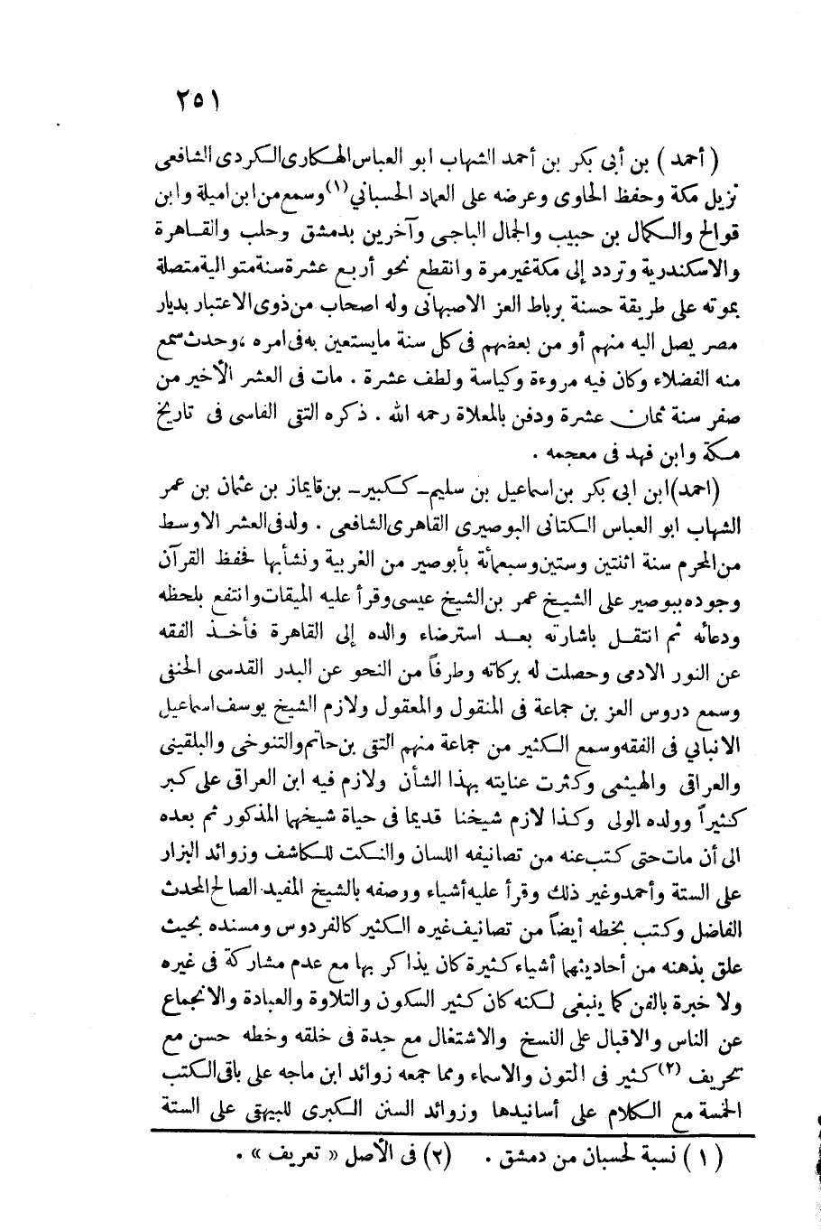 أَحْمد بن أبي بكر بن إِسْمَاعِيل بن سليم ككبير بن قايماز بن عُثْمَان بن عمر الشهَاب أَبُو الْعَبَّاس الكتاني البوصيري القاهري الشَّافِعِي. / ولد فِي الْعشْر الْأَوْسَط من الْمحرم سنة اثْنَتَيْنِ وَسِتِّينَ وَسَبْعمائة بأبوصير من الغربية وَنَشَأ بهَا فحفظ لقرآن وجوده ببوصير على الشَّيْخ عمر بن الشَّيْخ عِيسَى وَقَرَأَ عَلَيْهِ الْمِيقَات وانتفع بلحظه ودعائه ثمَّ انْتقل بإشارته بعد استرضاء وَالِده إِلَى الْقَاهِرَة فَأخذ الْفِقْه عَن النُّور الْآدَمِيّ وحصت لَهُ بركاته وطرفا من النَّحْو عَن الْبَدْر الْقُدسِي الْحَنَفِيّ وَسمع دروس الْعِزّ بن جمَاعَة فِي الْمَنْقُول والمعقول ولازم الشَّيْخ يُوسُف إِسْمَاعِيل الأنباني فِي الْفِقْه وَسمع الْكثير من جمَاعَة مِنْهُم التقي بن حَاتِم والتنوخي والبلقيني والعراقي)
