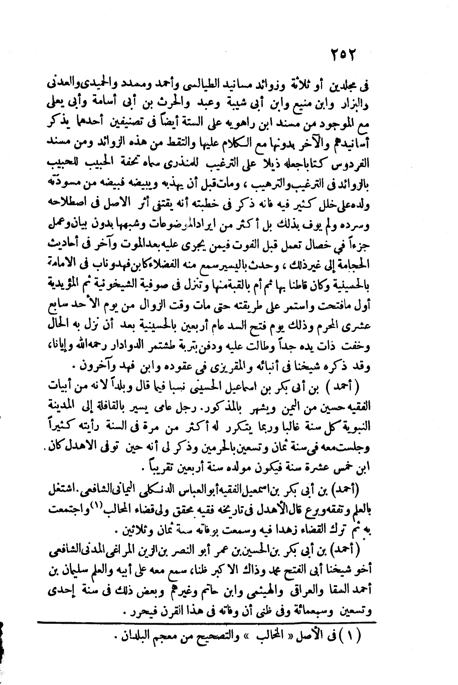 فِي مجلدين أَو ثَلَاثَة وزوائد مسانيد الطَّيَالِسِيّ وَأحمد ومسدد والْحميدِي والعدني وَالْبَزَّار وَابْن منيع وَابْن أبي شيبَة وَعبد والحرث بن أبي أُسَامَة وَأبي يعلى مَعَ الْمَوْجُود من مُسْند ابْن رَاهَوَيْه على السِّتَّة أَيْضا فِي تصنيفين أَحدهمَا يذكر أسانيدهم وَالْآخر بِدُونِهَا مَعَ الْكَلَام عَلَيْهَا والتقط من هَذِه الزَّوَائِد وَمن مُسْند الفردوس كتابا جعله ذيلا على التَّرْغِيب لِلْمُنْذِرِيِّ سَمَّاهُ تحفة الحبيب للحبيب بالزوائد فِي التَّرْغِيب والترهيب، وَمَات قبل أَن يهذبه ويبيضه فبيضه من مسودته وَلَده على خلل كثير فِيهِ فَإِنَّهُ ذكر فِي خطبَته أَنه يقتفي أثر الأَصْل فِي اصْطِلَاحه وسرده وَلم يوف بذلك بل أَكثر من إِيرَاد الموضوعات وَشبههَا بِدُونِ بَيَان عمل جُزْءا فِي خِصَال تعْمل قبل الْفَوْت فِيمَن يجْرِي عَلَيْهِ بعد الْمَوْت وَآخر فِي أَحَادِيث الْحجامَة إِلَى غير ذَلِك، وَحدث باليسير سمع مِنْهُ الْفُضَلَاء كَابْن فَهد وناب فِي الْإِمَامَة الحسينية وَكَانَ قاطنا بهَا ثمَّ أم بالقبة مِنْهَا وتنزل فِي صوفية الشيخونية ثمَّ المؤيدية أول مَا فتحت وَاسْتمرّ على طَرِيقَته حَتَّى مَاتَ وَقت الزَّوَال من يَوْم الْأَحَد سَابِع عشري الْمحرم وَذَلِكَ يَوْم فتح السد عَام أَرْبَعِينَ بالحسينية بعد أَن نزل بِهِ الْحَال وَخفت ذَات يَده جدا وطالت عَلَيْهِ وَدفن بتربة طشتمر الدوادار رَحمَه الله وإيانا، وَقد ذكره شَيخنَا فِي أنبائه والمقريزي فِي عقوده وَابْن فَهد وَآخَرُونَ.