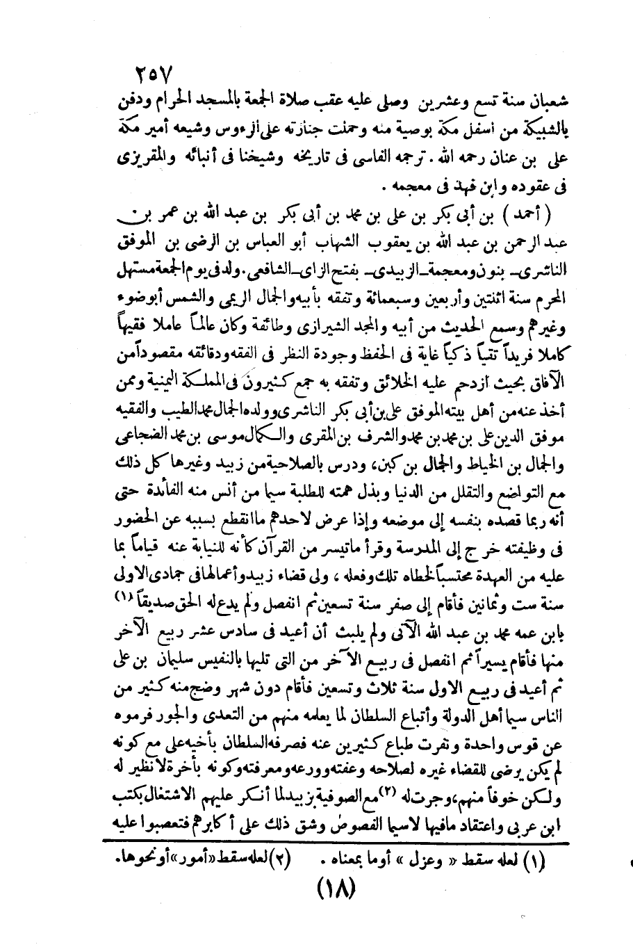 شعْبَان سنة تسع وَعشْرين وَصلى عَلَيْهِ عقب صَلَاة الْجُمُعَة بِالْمَسْجِدِ الْحَرَام وَدفن بالشبيكة من أَسْفَل مَكَّة بِوَصِيَّة مِنْهُ وحملت جنَازَته على الرؤوس وشيعه أَمِير مَكَّة عَليّ بن عنان رَحمَه الله. تَرْجمهُ الفاسي فِي تَارِيخه وَشَيخنَا فِي أنبائه والمقريزي فِي عقوده وَابْن فَهد فِي مُعْجَمه.