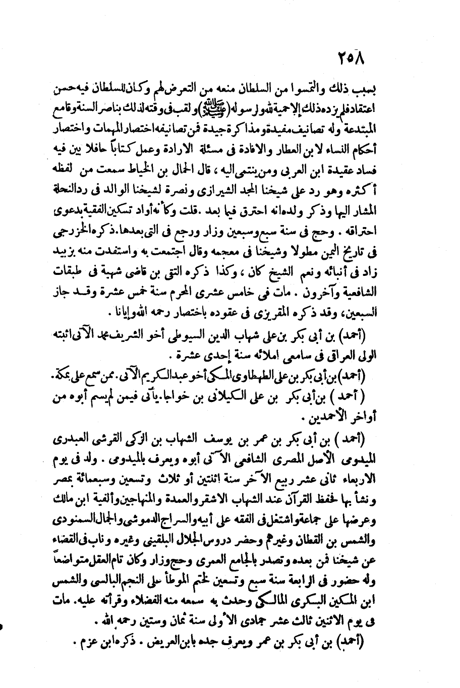 بِسَبَب ذَلِك والتمسوا من السُّلْطَان مَنعه من التَّعَرُّض لَهُم وَكَانَ السُّلْطَان فِيهِ حسن اعْتِقَاد فَلم يزده ذَلِك أَلا حمية لله وَلِرَسُولِهِ صلى الله عَلَيْهِ وَسلم ولقب فِي وقته لذَلِك بناصر السّنة وقامع المبتدعة وَله تصانيف مفيدة ومذاكرة جَيِّدَة فَمن تصانيفه اخْتِصَار الْمُهِمَّات واختصار أَحْكَام النِّسَاء لِابْنِ الْعَطَّار والإفادة فِي مَسْأَلَة الْإِرَادَة وَعمل كتابا حافلا بَين فِيهِ فَسَاد عقيدة ابْن الْعَرَبِيّ وَمن ينتمي إِلَيْهِ، قَالَ الْحمال بن الْخياط سَمِعت من لَفظه أَكْثَره وَهُوَ رد على شَيخنَا الْمجد الشِّيرَازِيّ ونصرة لشَيْخِنَا الْوَالِد فِي رد النحلة الْمشَار إِلَيْهَا وَذكر وَلَده أَنه احْتَرَقَ فِيمَا بعد. قلت وَكَأَنَّهُ أَرَادَ تسكين الفقية بِدَعْوَى احتراقه. وَحج فِي سنة سبع وَسبعين وزار وَرجع فِي الَّتِي بعْدهَا. ذكره الخزرجي فِي تَارِيخ الْيمن مطولا وَشَيخنَا فِي مُعْجَمه وَقَالَ اجْتمعت بِهِ واستفدت مِنْهُ بزبيد زَاد فِي أنبائه وَنعم الشَّيْخ كَانَ، وَكَذَا ذكره التقي بن قَاضِي شُهْبَة فِي طَبَقَات الشَّافِعِيَّة وَآخَرُونَ. مَاتَ فِي خَامِس عشري الْمحرم سنة خمس عشرِيَّة وَقد جَازَ السّبْعين، وَقد ذكره المقريزي فِي عقوده بِاخْتِصَار رَحمَه الله وإيانا.