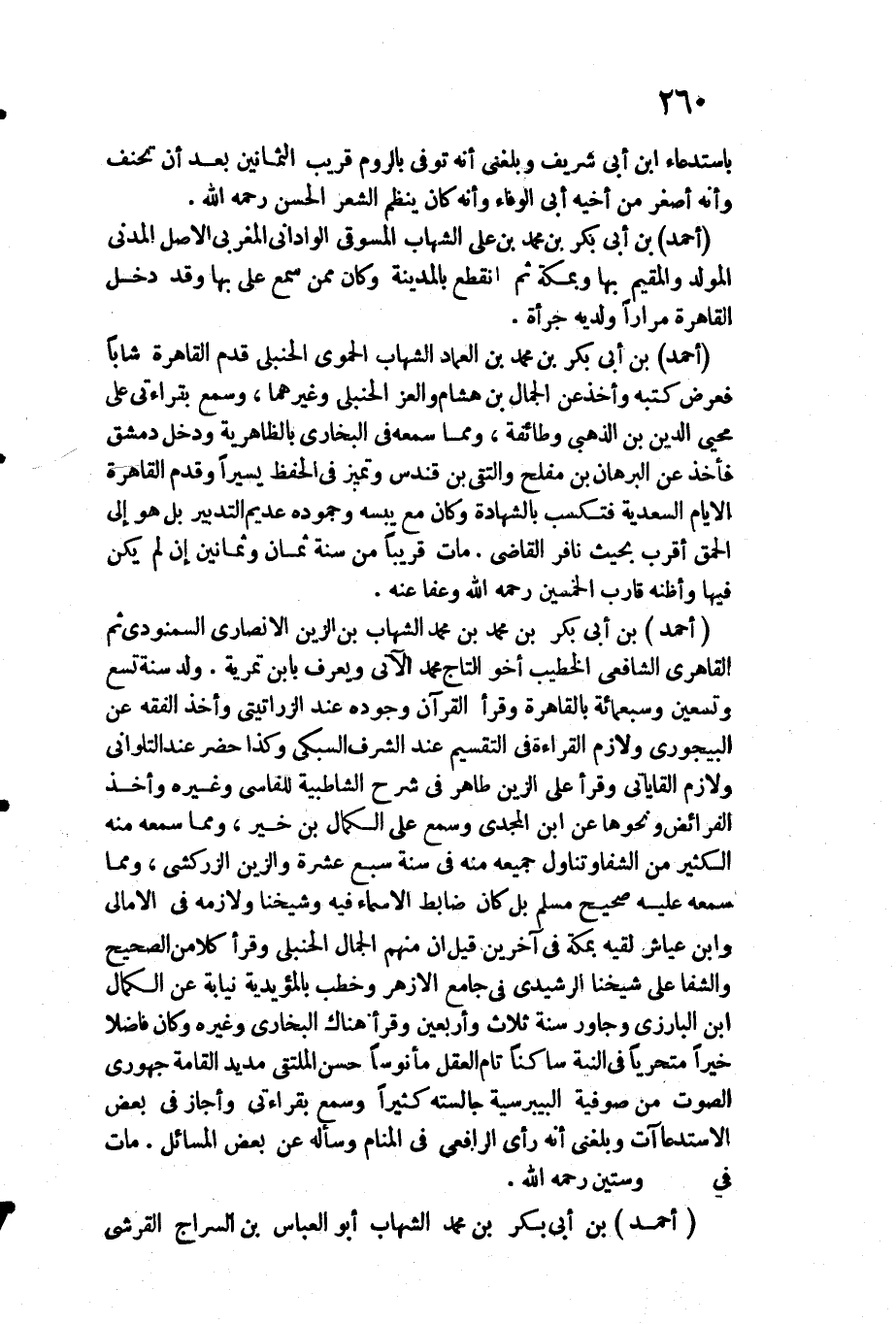 أَحْمد بن أبي بكر بن مُحَمَّد بن الْعِمَاد الشهَاب الْحَمَوِيّ الْحَنْبَلِيّ / قدم الْقَاهِرَة شَابًّا فَعرض كتبه وَأخذ عَن الْجمال بن هِشَام والعز الْحَنْبَلِيّ وَغَيرهمَا، وَسمع بِقِرَاءَتِي على محيي الدّين بن الذَّهَبِيّ وَطَائِفَة، وَمِمَّا سَمعه فِي البُخَارِيّ بالظاهرية وَدخل دمشق فَأخذ عَن الْبُرْهَان بن مُفْلِح والتقي بن قندس وتميز فِي الْحِفْظ يَسِيرا وَقدم الْقَاهِرَة الْأَيَّام السعدية فتكسب بِالشَّهَادَةِ وَكَانَ مَعَ يبسه وجموده عديم التَّدْبِير بل هُوَ إِلَى الْحمق أقرب بِحَيْثُ نافر القَاضِي. مَاتَ قَرِيبا من سنة ثَمَان وَثَمَانِينَ إِن لم يكن فِيهَا وَأَظنهُ قَارب الْخمسين رَحمَه الله وَعَفا عَنهُ.