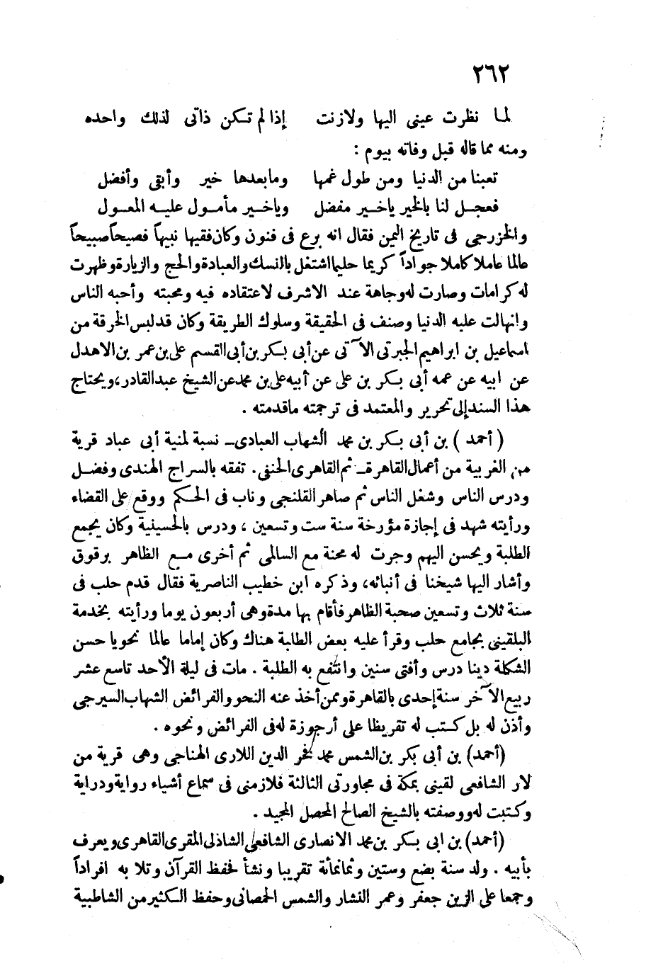 وَتِسْعين، ودرس بالحسينية وَكَانَ يجمع الطّلبَة وَيحسن إِلَيْهِم وَجَرت لَهُ محنة مَعَ السالمي ثمَّ أُخْرَى مَعَ الظَّاهِر برقوق وَأَشَارَ إِلَيْهَا شَيخنَا فِي أنبائه، وَذكره ابْن خطيب الناصرية فَقَالَ قدم حلب فِي سنة ثَلَاث وَتِسْعين صُحْبَة الظَّاهِر فَأَقَامَ بهَا مُدَّة وَهِي أَرْبَعُونَ يَوْمًا ورأيته بِخِدْمَة البُلْقِينِيّ بِجَامِع حلب وَقَرَأَ عَلَيْهِ بعض الطّلبَة هُنَاكَ وَكَانَ إِمَامًا عَالما نحويا حسن الشكلة دينا درس وَأفْتى سِنِين وانتفع بِهِ الطّلبَة. مَاتَ فِي لَيْلَة الْأَحَد تَاسِع عشر ربيع الآخر سنة إِحْدَى بِالْقَاهِرَةِ وَمِمَّنْ أَخذ عَنهُ النَّحْو والفرائض الشهَاب السيرجي وَأذن لَهُ بل كتب لَهُ تقريظا على أرجوزة لَهُ فِي الْفَرَائِض وَنَحْوه.