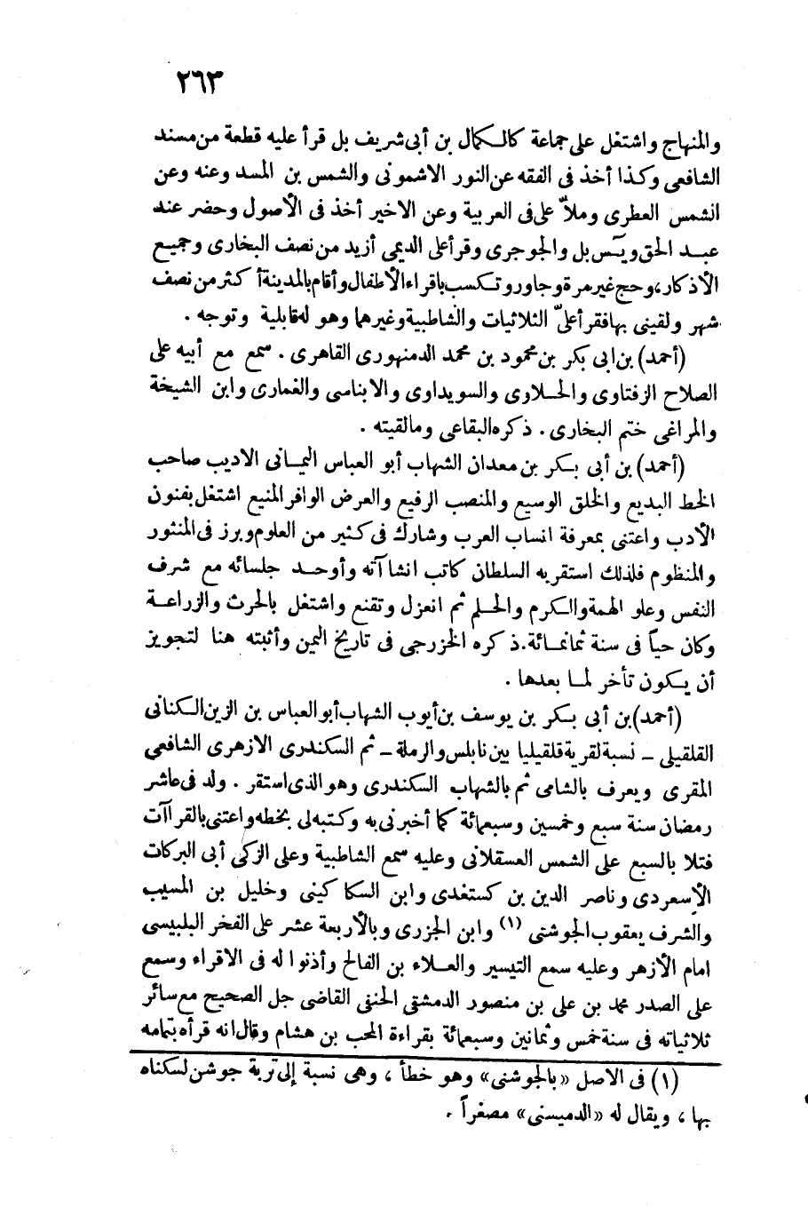 والمنهاج واشتغل على جمَاعَة كالكمال بن أبي شرِيف بل قَرَأَ عَلَيْهِ قِطْعَة من مُسْند الشَّافِعِي وَكَذَا أَخذ فِي الْفِقْه عَن النُّور الأشموني وَالشَّمْس بن المسد وَعنهُ وَعَن الشَّمْس العطري وملا عَليّ فِي العريبة وَعَن الْأَخير أَخذ فِي الْأُصُول وَحضر عِنْد عبد الْحق وَيس بل والجوجري وَقَرَأَ على الديمي أَزِيد من نصف البُخَارِيّ وَجَمِيع الْأَذْكَار، وَحج غير مرّة وجاور وتكسب بإقراء الْأَطْفَال وَأقَام بِالْمَدِينَةِ أَكثر من نصف شهر ولقيني بهَا فَقَرَأَ عَليّ الثلاثيات والشاطبية وَغَيرهمَا وَهُوَ لَهُ قابلية وَتوجه.